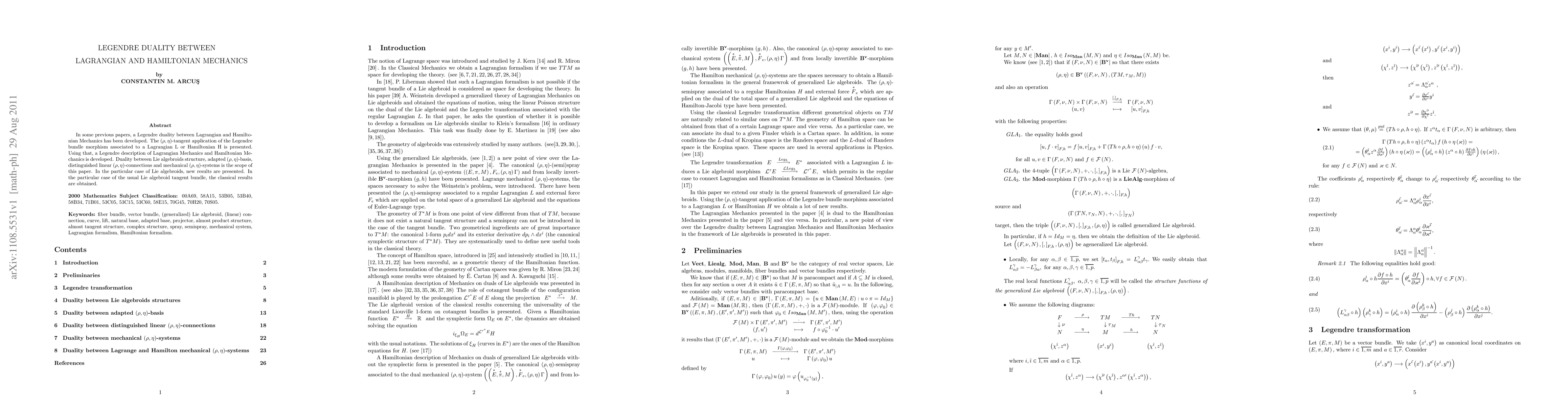This paper explores the Legendre duality between Lagrangian and Hamiltonian mechanics through the (\rho,\eta)-tangent application of the Legendre bundle morphism, developing a dual description of both mechanics frameworks. It highlights new results for Lie algebroids and recovers classical results for the usual Lie algebroid tangent bundle.