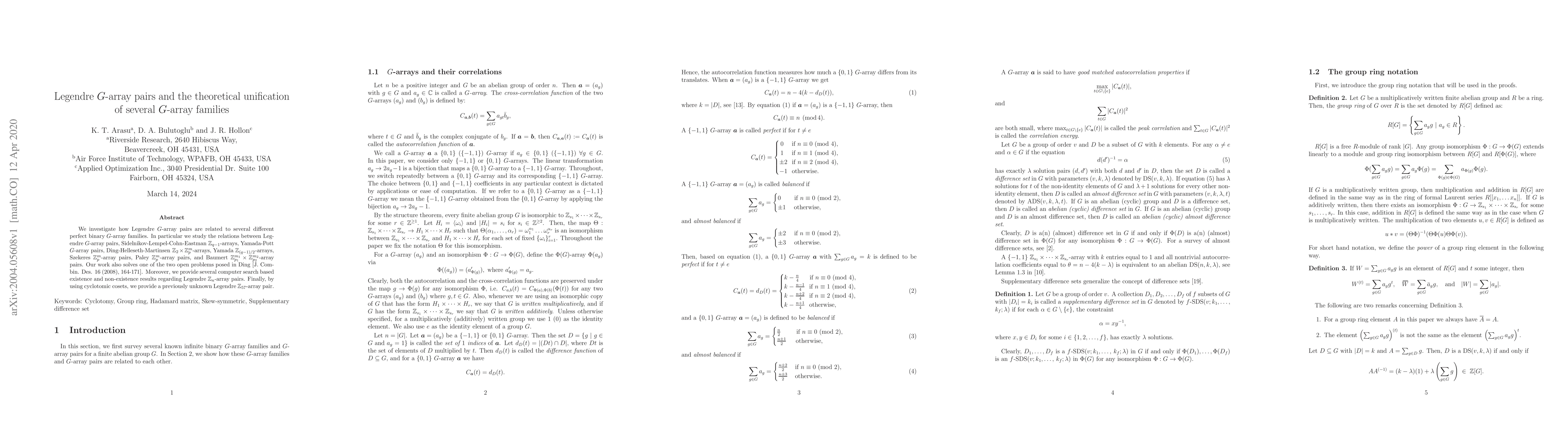 We investigate how Legendre $G$-array pairs are related to several different perfect binary $G$-array families. In particular we study the relations between Legendre $G$-array pairs, Sidelnikov-Lempel-Cohn-Eastman $\mathbb{Z}_{q-1}$-arrays, Yamada-Pott $G$-array pairs, Ding-Helleseth-Martinsen $\mathbb{Z}_{2}\times \mathbb{Z}_p^{m}$-arrays, Yamada $\mathbb{Z}_{(q-1)/2}$-arrays, Szekeres $\mathbb{Z}^m_{p}$-array pairs, Paley $\mathbb{Z}^m_{p}$-array pairs, and Baumert $\mathbb{Z}^{m_1}_{p_1}\times \mathbb{Z}^{m_2}_{p_2}$-array pairs. Our work also solves one of the two open problems posed in Ding~[J. Combin. Des. 16 (2008), 164-171]. Moreover, we provide several computer search based existence and non-existence results regarding Legendre $\mathbb{Z}_n$-array pairs. Finally, by using cyclotomic cosets, we provide a previously unknown Legendre $\mathbb{Z}_{57}$-array pair.