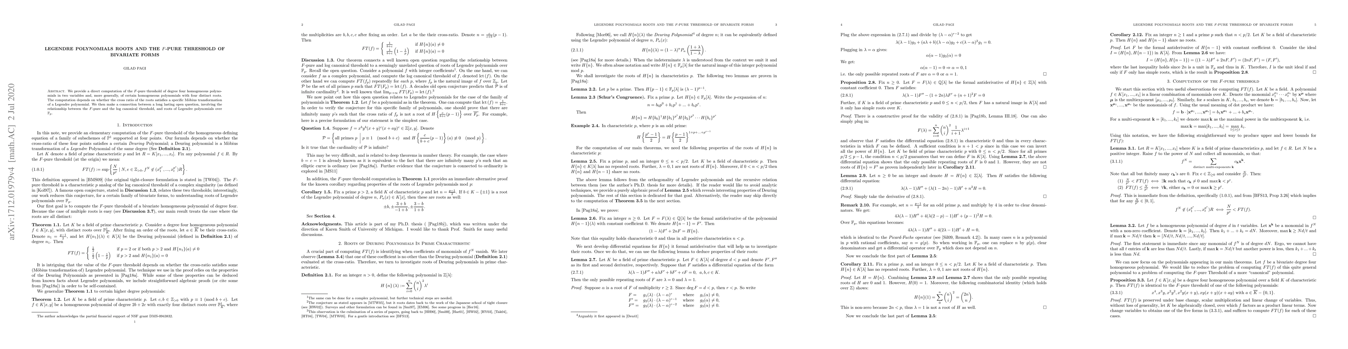 This paper computes the $F$-pure threshold for degree four bivariate polynomials with four distinct roots, linking the result to the cross ratio of the roots and a specific Möbius transformation of Legendre polynomials. It also connects this computation to an open question regarding the relationship between the $F$-pure and log canonical thresholds.