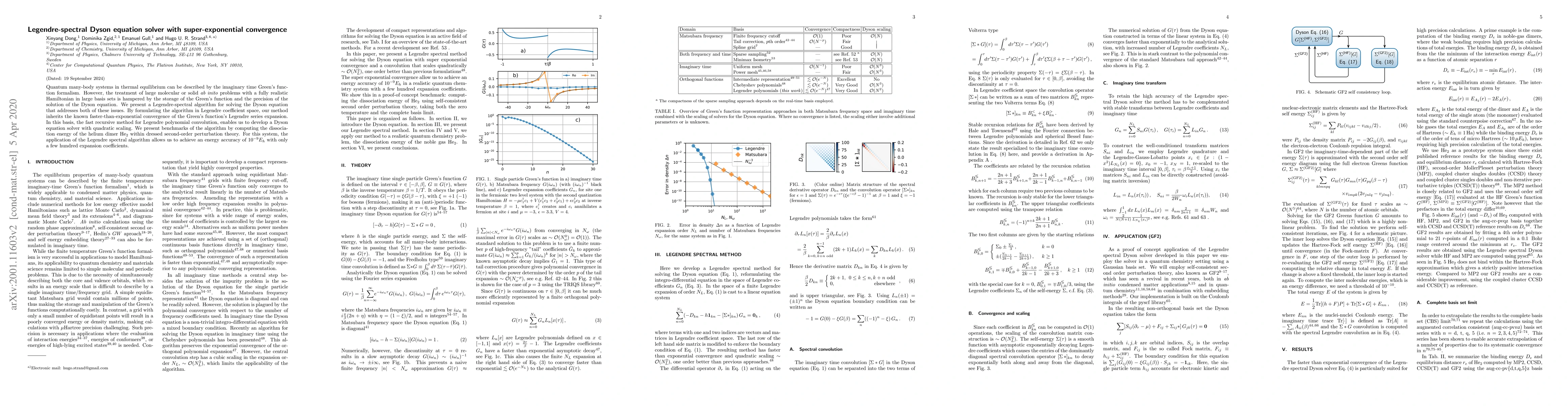 This paper introduces a Legendre-spectral algorithm for solving the Dyson equation in quantum many-body systems, achieving super-exponential convergence and quadratic scaling. The method leverages the rapid convergence of the Green's function's Legendre series expansion and demonstrates high accuracy in computing the dissociation energy of the helium dimer.