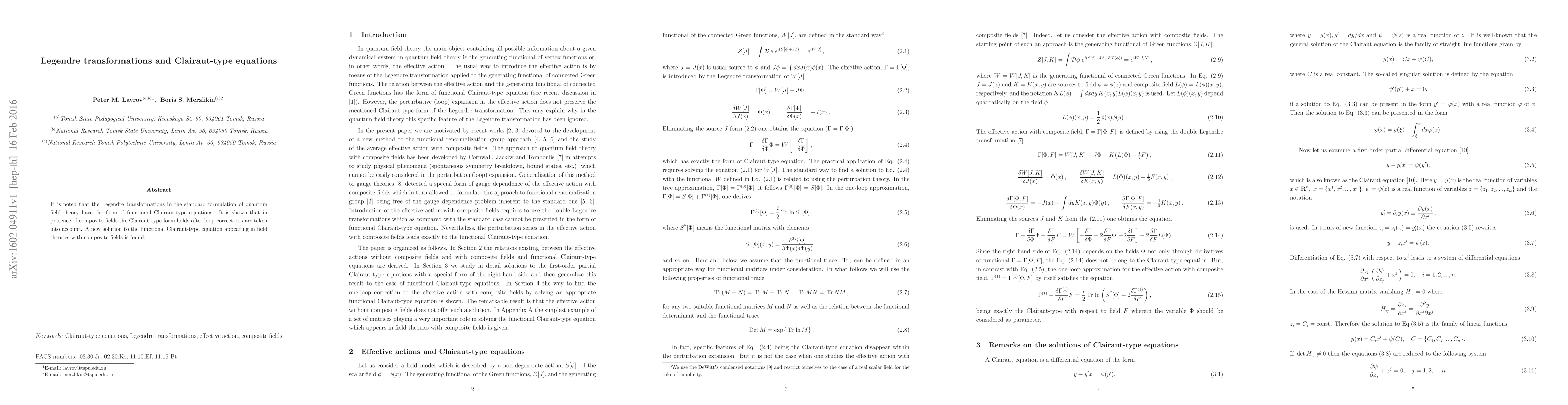 Researchers found that Legendre transformations in quantum field theory remain Clairaut-type equations even with composite fields and loop corrections, leading to a new solution for these equations.