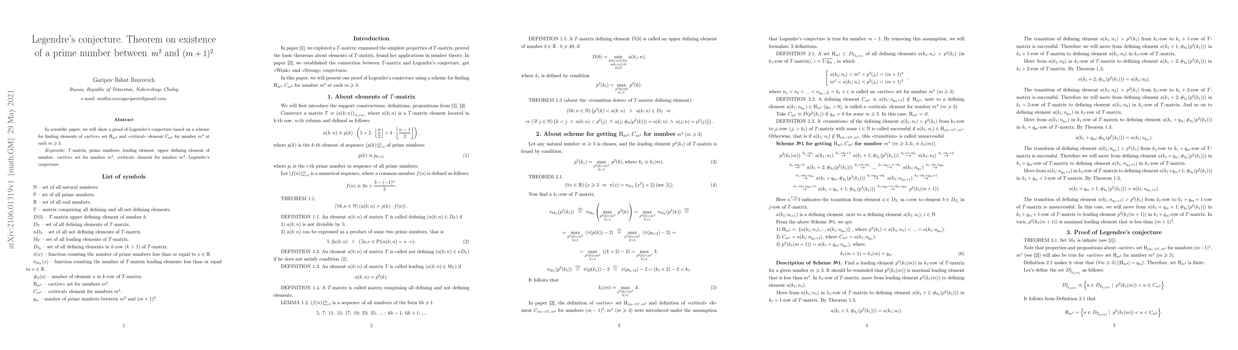 Summary: This paper proves Legendre's conjecture by demonstrating the existence of a prime number between $m^{2}$ and $(m+1)^{2}$ for all $m \ge 3$, utilizing a method to identify "active" set ${\rm H}_{m^{4}}$ and "critical" element $C_{m^{4}}$ for $m^{4}$.