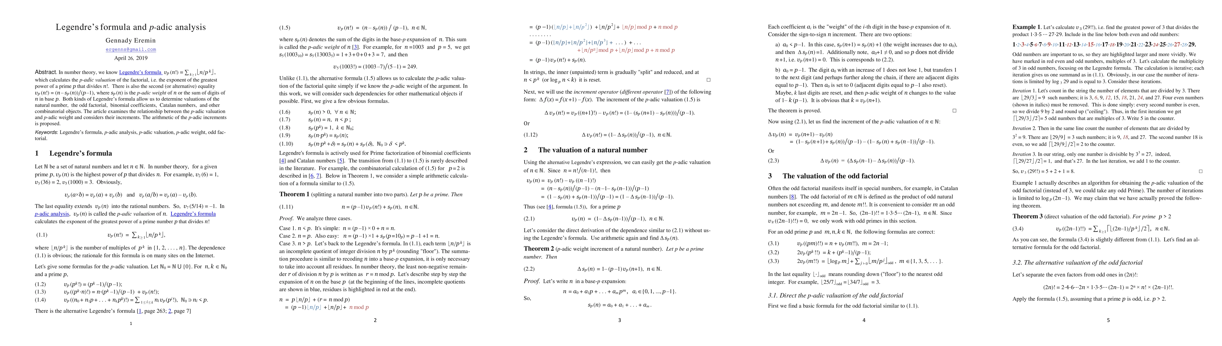 In number theory, we know Legendre's formula $ v_p(n!) = \sum_{k \ge 1} \lfloor \frac{n}{p^k} \rfloor $, which calculates the $p$-adic valuation of the factorial, i.e. the exponent of the greatest power of a prime $p$ that divides $n!$. There is also the second (or alternative) equality $ v_p (n!) = \frac{n-s_p(n)}{p-1} $ where $s_p(n)$ is the $p$-adic weight of $n$ or the sum of digits of $n$ in base $p$. Both kinds of Legendre's formula allow us to determine valuations of the natural number, the odd factorial, binomial coefficients, Catalan numbers, and other combinatorial objects. The article examines the relationship between the $p$-adic valuation and $p$-adic weight and considers their increments. The arithmetic of the $p$-adic increments is proposed.