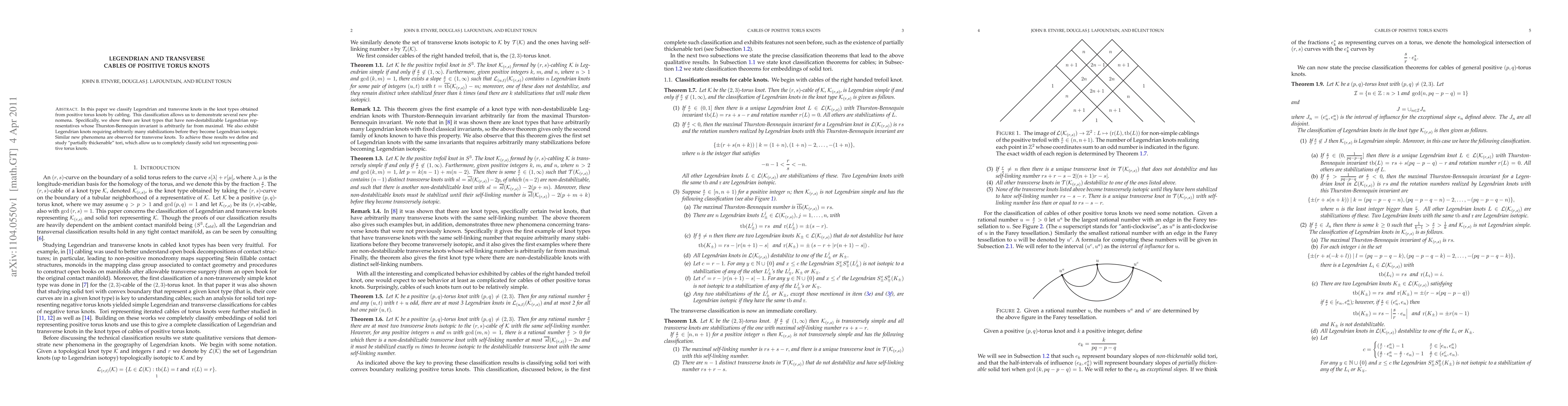 The paper classifies Legendrian and transverse knots in knot types obtained from positive torus knots via cabling, using 'partially thickenable' tori to achieve a complete classification of solid tori representing positive torus knots.