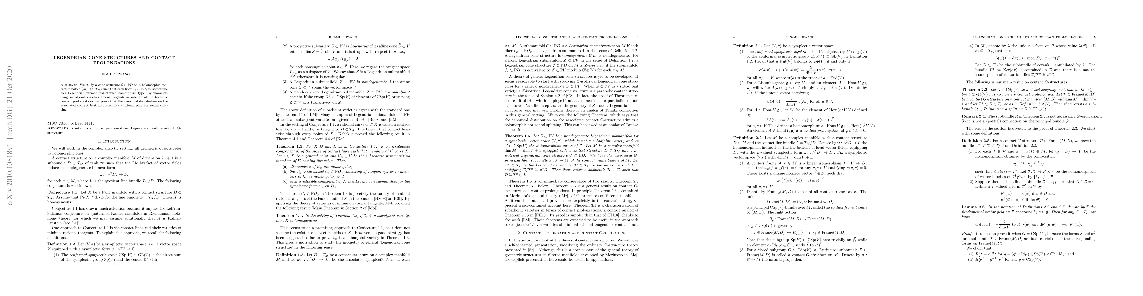 We study a cone structure ${\mathcal C} \subset {\mathbb P} D$ on a holomorphic contact manifold $(M, D \subset T_M)$ such that each fiber ${\mathcal C}_x \subset {\mathbb P} D_x$ is isomorphic to a Legendrian submanifold of fixed isomorphism type. By characterizing subadjoint varieties among Legendrian submanifolds in terms of contact prolongations, we prove that the canonical distribution on the associated contact G-structure admits a holomorphic horizontal splitting.