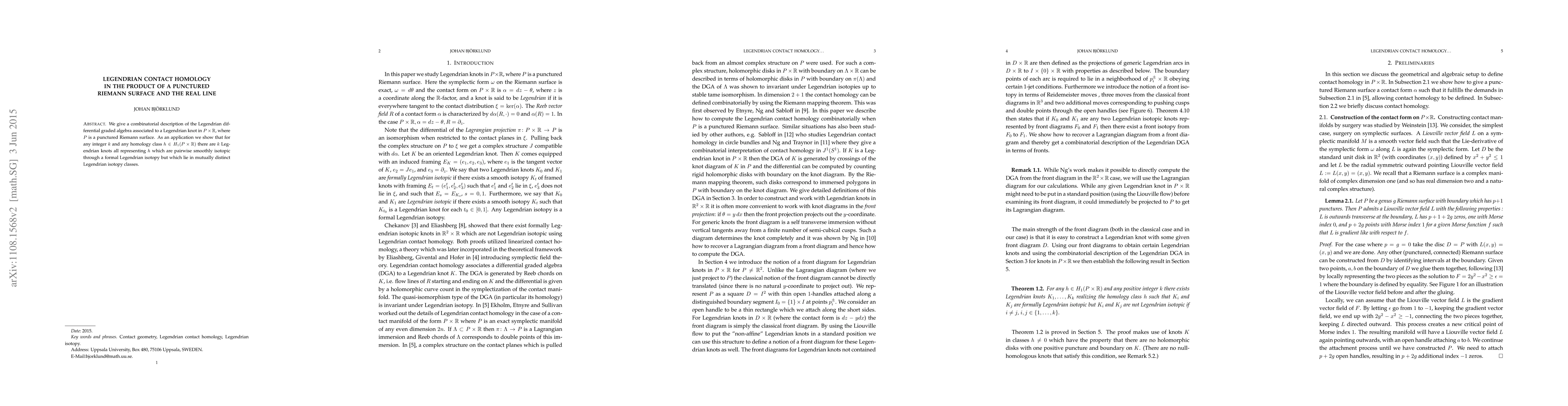 We give a combinatorial description of the Legendrian differential graded algebra associated to a Legendrian knot in PxR, where P is a punctured Riemann surface. As an application we show that for any integer k and any homology class h in H_1(PxR) there are k Legendrian knots all representing h which are pairwise smoothly isotopic through a formal Legendrian isotopy but which lie in mutually distinct Legendrian isotopy classes.