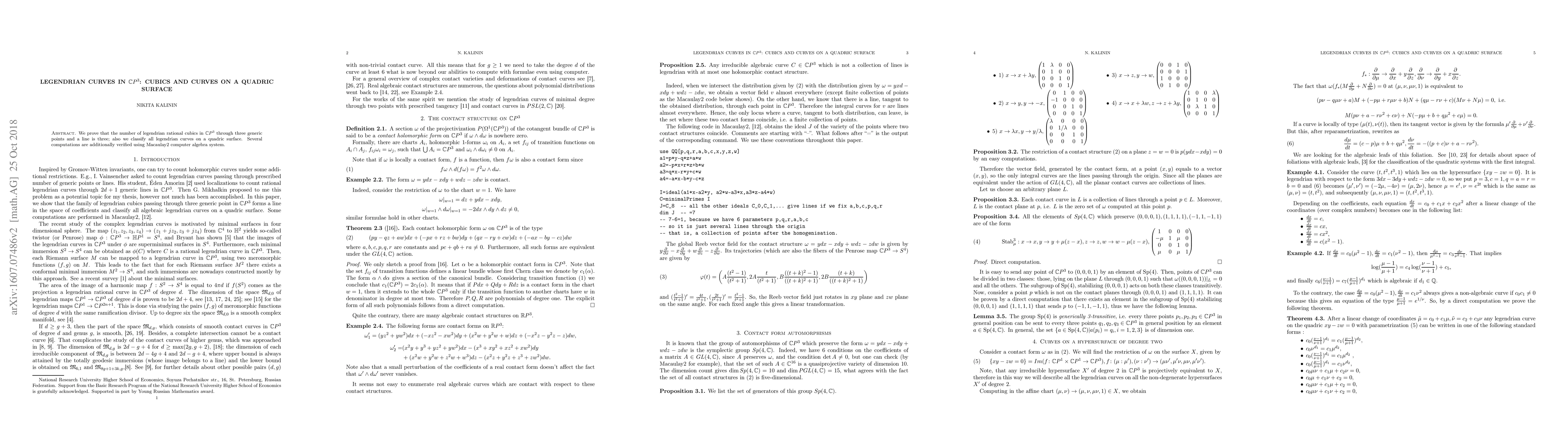 Summary: This paper proves that there are exactly three legendrian rational cubics in $\mathbb C P^3$ passing through three generic points and a line, and classifies all legendrian curves on a quadric surface, with computations verified using Macaulay2.