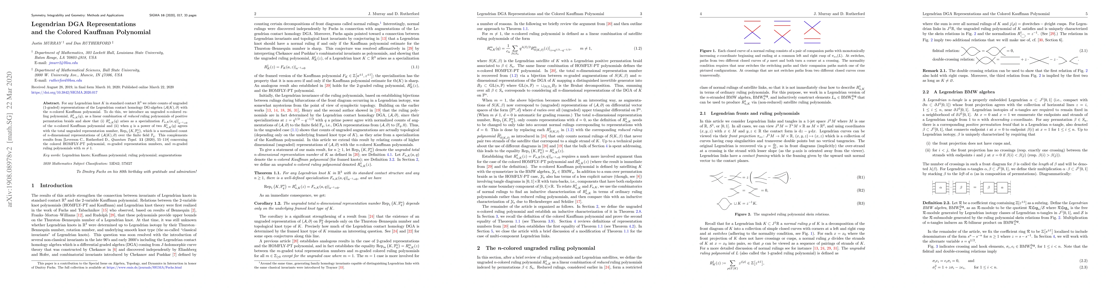This paper establishes a connection between counts of ungraded representations of Legendrian contact homology DG-algebras for Legendrian knots and the n-colored Kauffman polynomial. It introduces an ungraded n-colored ruling polynomial that matches the n-colored Kauffman polynomial under specific conditions and agrees with the total ungraded representation count over finite fields when q is a power of two.