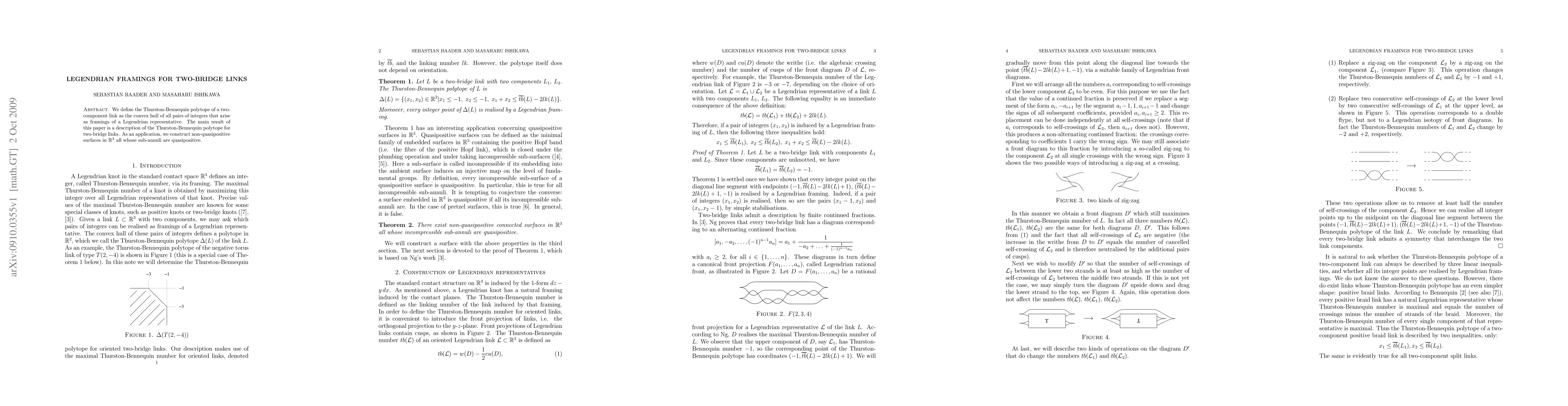 Summary: This paper defines the Thurston-Bennequin polytope for two-component links and specifically describes it for two-bridge links, utilizing Legendrian framings. It also applies this construction to create non-quasipositive surfaces in \(\mathbb{R}^3\) with quasipositive sub-annuli.