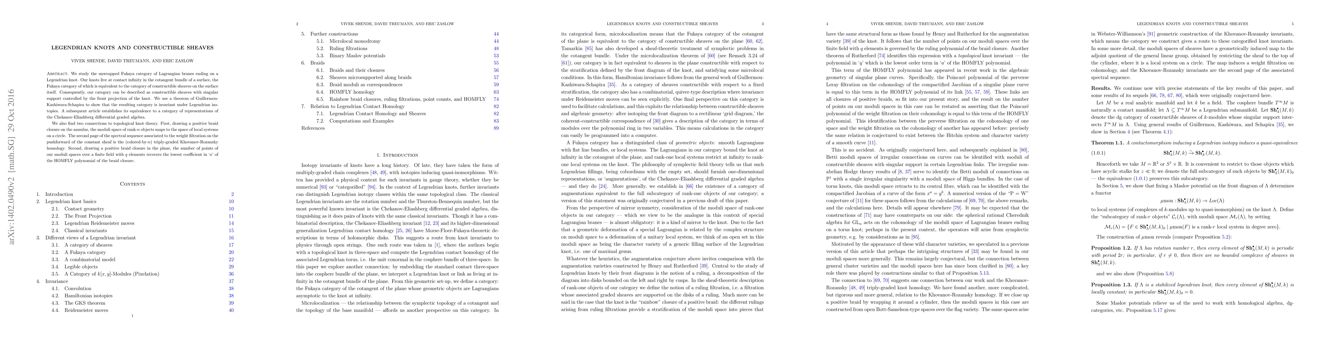 We study the unwrapped Fukaya category of Lagrangian branes ending on a Legendrian knot. Our knots live at contact infinity in the cotangent bundle of a surface, the Fukaya category of which is equivalent to the category of constructible sheaves on the surface itself. Consequently, our category can be described as constructible sheaves with singular support controlled by the front projection of the knot. We use a theorem of Guillermou-Kashiwara-Schapira to show that the resulting category is invariant under Legendrian isotopies, and conjecture it is equivalent to the representation category of the Chekanov-Eliashberg differential graded algebra. We also find two connections to topological knot theory. First, drawing a positive braid closure on the annulus, the moduli space of rank-n objects maps to the space of local systems on a circle. The second page of the spectral sequence associated to the weight filtration on the pushforward of the constant sheaf is the (colored-by-n) triply-graded Khovanov-Rozansky homology. Second, drawing a positive braid closure in the plane, the number of points of our moduli spaces over a finite field with q elements recovers the lowest coefficient in 'a' of the HOMFLY polynomial of the braid closure.