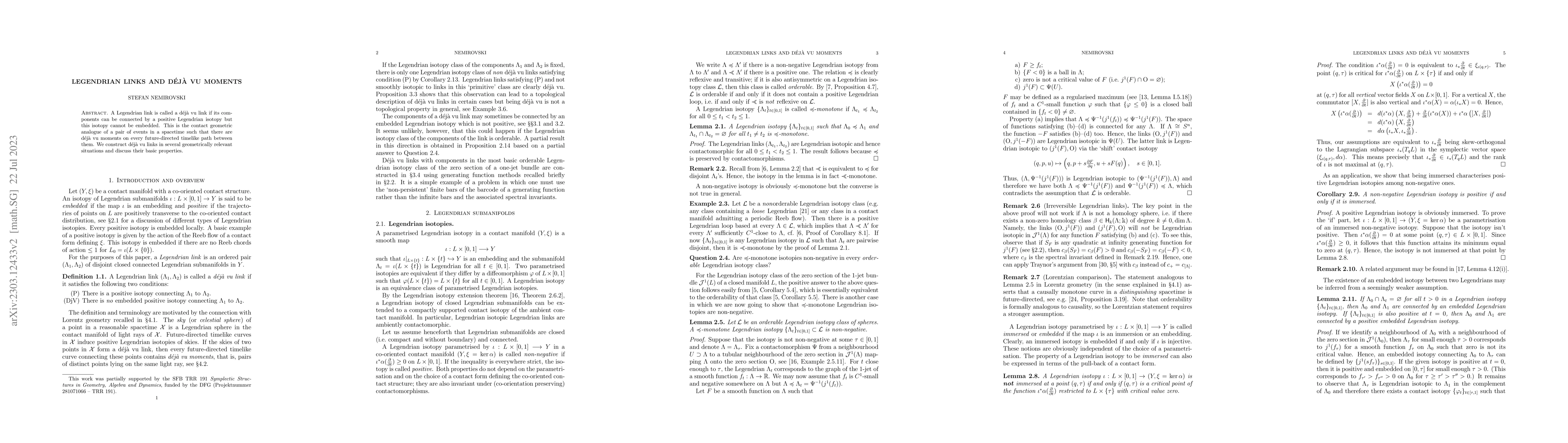 This paper explores the concept of d\'ej\`a vu links, a type of Legendrian link in contact geometry, where components can be connected by a positive Legendrian isotopy but not embedded, analogous to d\'ej\`a vu moments in spacetime. The authors construct and analyze these links in various geometric contexts.