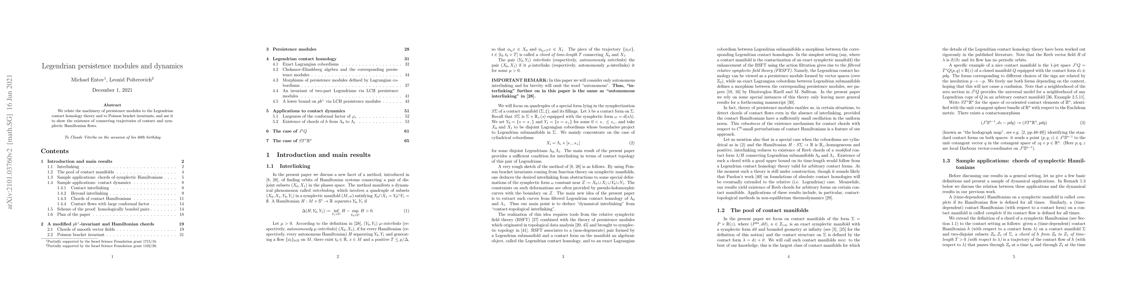 This paper connects persistence modules to Legendrian contact homology and Poisson bracket invariants, demonstrating the existence of connecting trajectories in contact and symplectic Hamiltonian flows. The study bridges topological data analysis and dynamical systems.