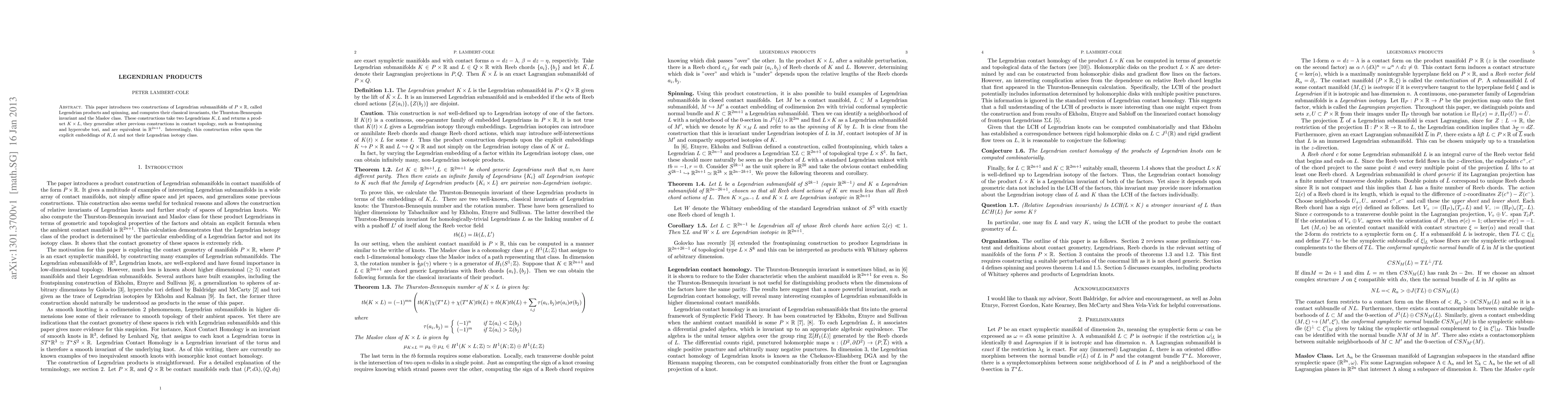 This paper introduces two constructions of Legendrian submanifolds, called the Legendrian product and spinning, and computes their classical invariants, the Thurston-Bennequin invariant and the Maslov class, in R^{2n+1}. These constructions take two Legendrians K,L and returns a product K x L, they generalize other previous constructions in contact topology, such as frontspinning and hypercube tori, and are equivalent in R^{2n+1}. Interestingly, this construction relies upon the explicit embeddings of K,L and not their Legendrian isotopy classes.