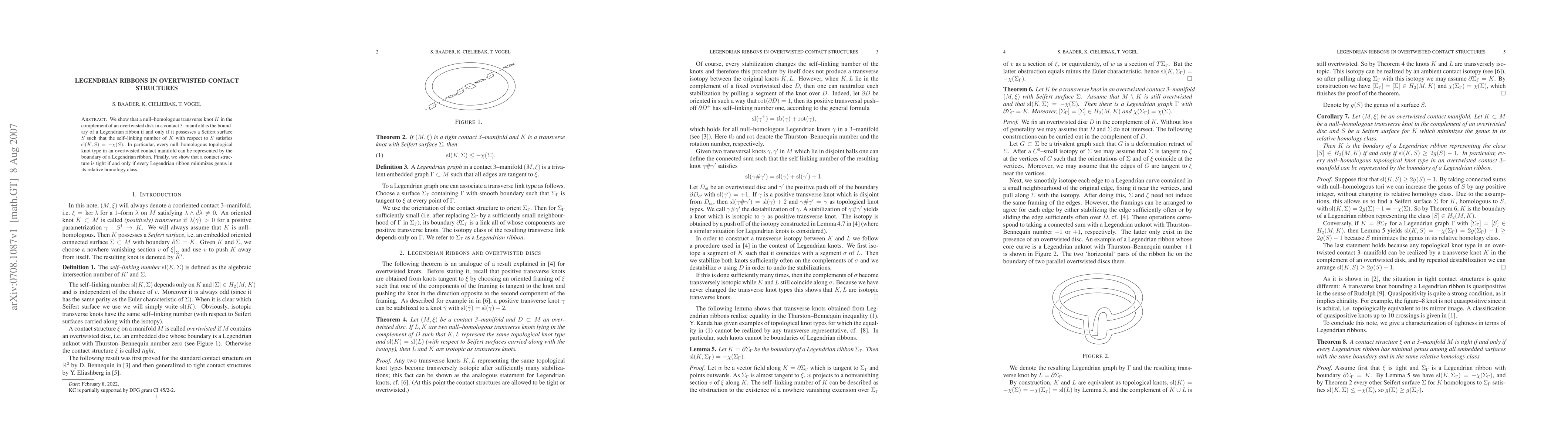 Summary: The paper establishes that a null-homologous transverse knot in an overtwisted contact 3-manifold bounds a Legendrian ribbon if its self-linking number with a specific Seifert surface equals the negative Euler characteristic of the surface. It also proves that tight contact structures are characterized by Legendrian ribbons minimizing genus in their relative homology class.