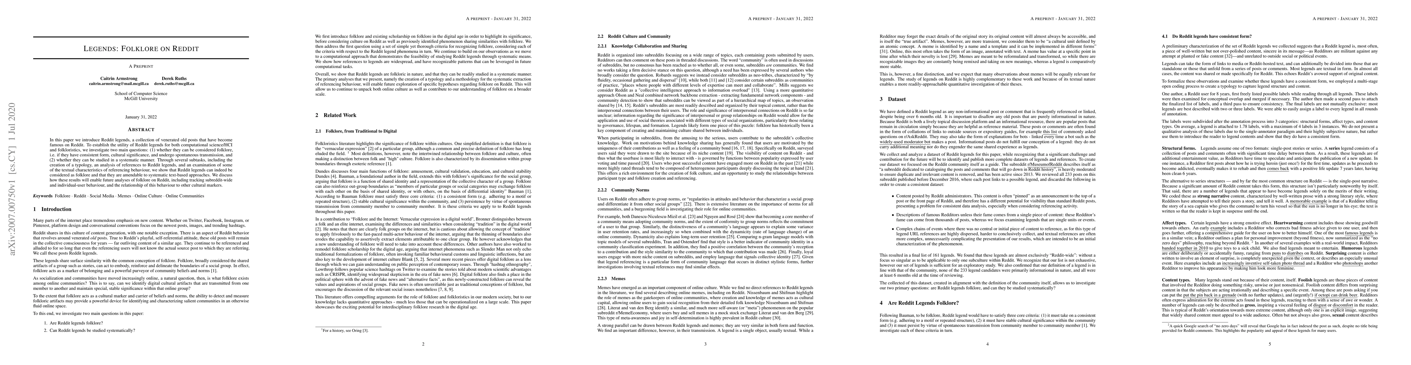 This paper explores Reddit legends as a form of folklore, examining their cultural significance and systematic study potential. It concludes that Reddit legends exhibit consistent form, cultural importance, and spontaneous transmission, thus qualifying them as folklore and enabling text-based analyses for future cultural studies.