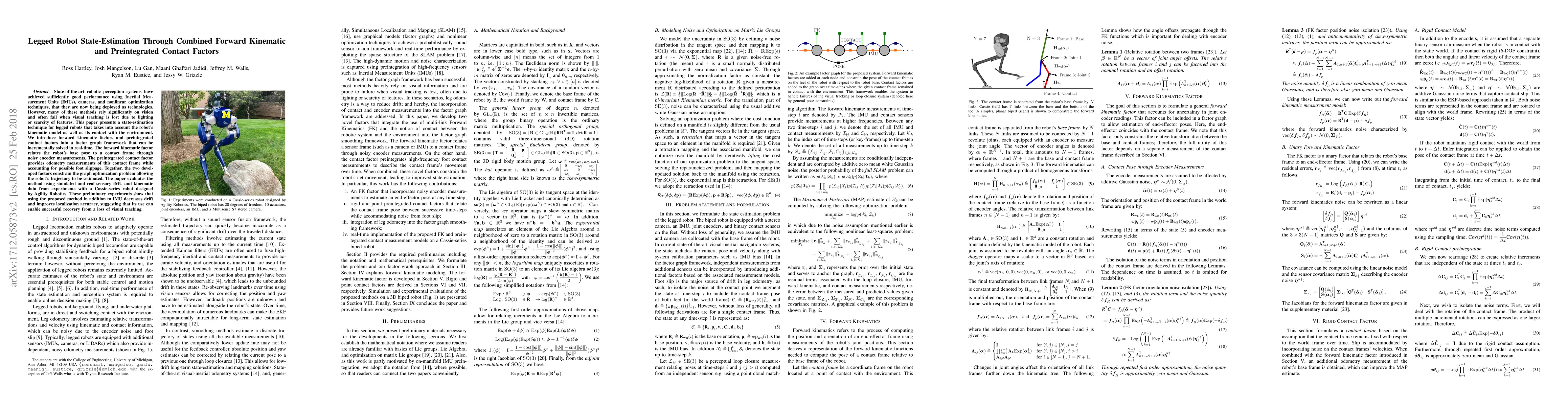 This paper proposes a state-estimation technique for legged robots incorporating forward kinematic and preintegrated contact factors into a factor graph for real-time optimization. The method reduces drift and enhances localization accuracy by leveraging encoder measurements and contact odometry, demonstrating improved performance over IMU alone.