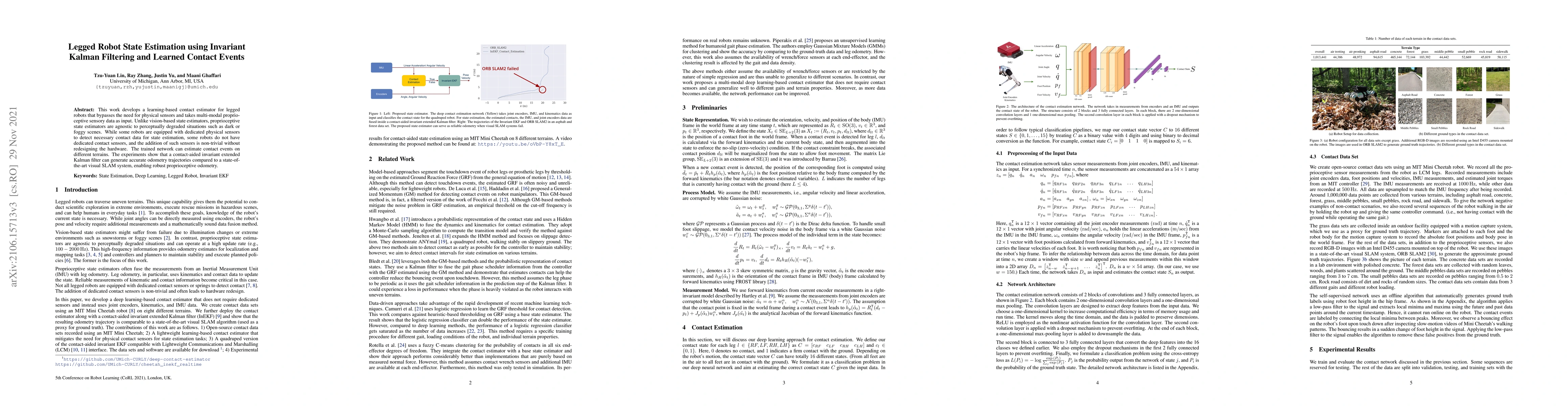 This paper proposes a learning-based contact estimator for legged robots that uses multi-modal proprioceptive data to estimate state without physical sensors, demonstrating robust performance in various terrains and conditions. The contact-aided invariant extended Kalman filter achieves accurate odometry comparable to visual SLAM systems.