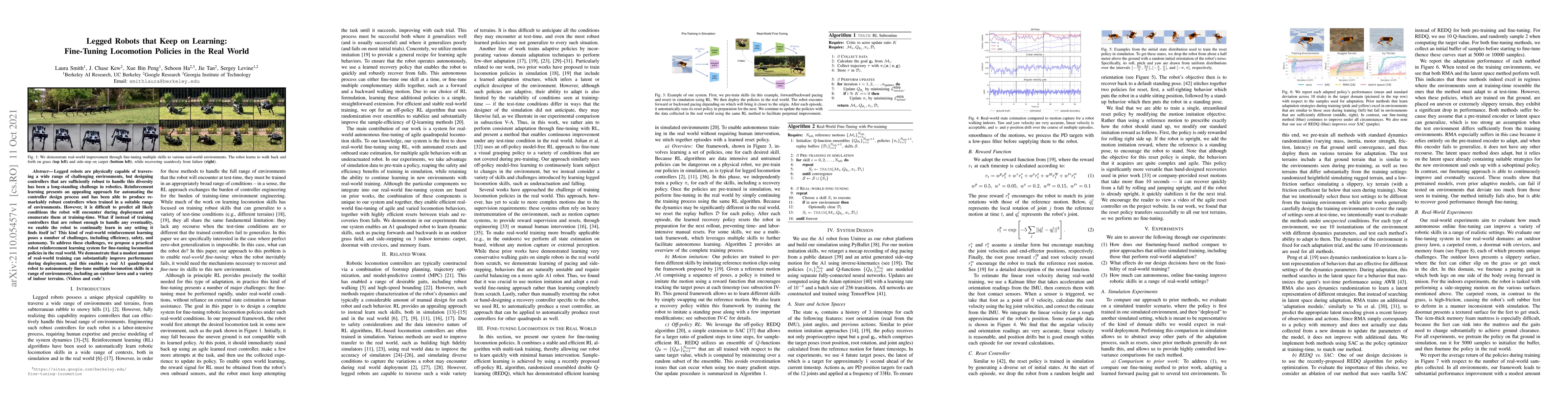 This paper proposes a reinforcement learning system to enable legged robots to continually improve their locomotion policies in real-world settings. The approach demonstrates significant performance gains through modest real-world training, allowing a quadrupedal robot to autonomously adapt to diverse environments.