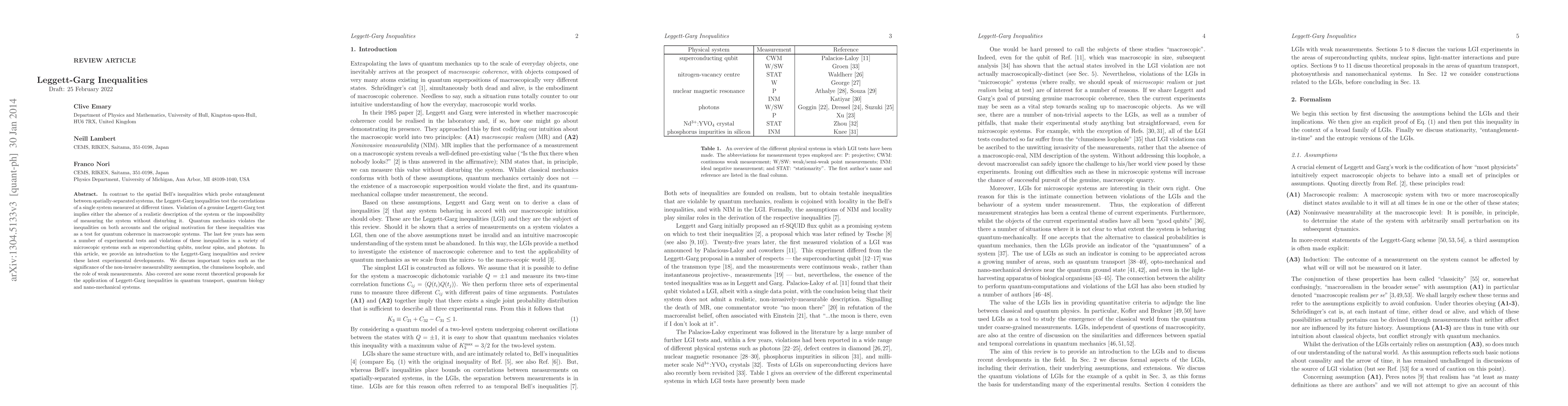 This paper introduces Leggett-Garg inequalities, which test correlations in a single system over time, and reviews recent experimental violations in systems like superconducting qubits and photons, highlighting the significance of non-invasive measurability and the role of weak measurements.