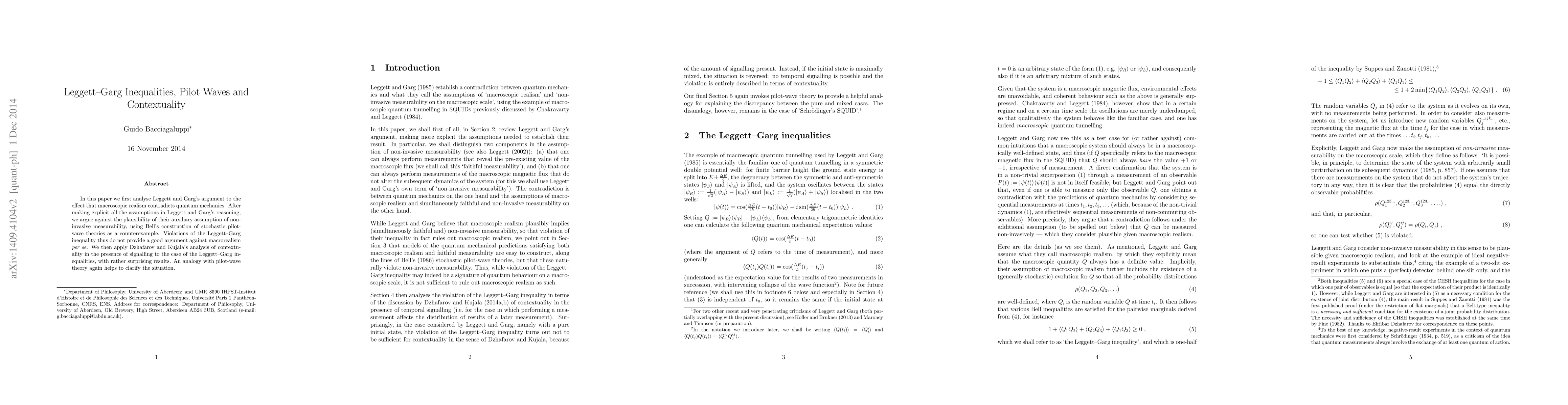 In this paper we first analyse Leggett and Garg's argument to the effect that macroscopic realism contradicts quantum mechanics. After making explicit all the assumptions in Leggett and Garg's reasoning, we argue against the plausibility of their auxiliary assumption of non-invasive measurability, using Bell's construction of stochastic pilot-wave theories as a counterexample. Violations of the Leggett-Garg inequality thus do not provide a good argument against macrorealism per se. We then apply Dzhafarov and Kujala's analysis of contextuality in the presence of signalling to the case of the Leggett-Garg inequalities, with rather surprising results. An analogy with pilot-wave theory again helps to clarify the situation.