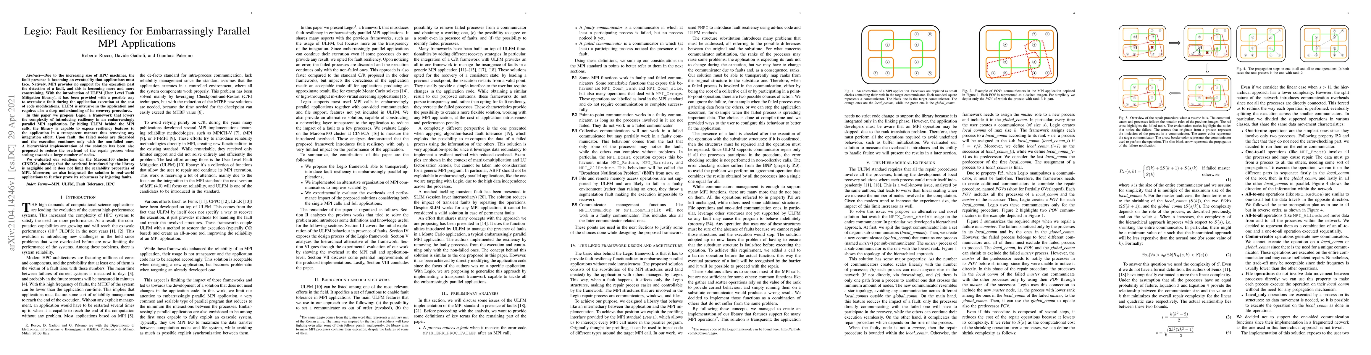 Legio is a framework designed to introduce fault resiliency into embarrassingly parallel MPI applications without requiring code modifications. It transparently integrates the User Level Fault Mitigation (ULFM) library, allowing applications to continue execution after faults by discarding failed nodes, thus maintaining scalability and performance.