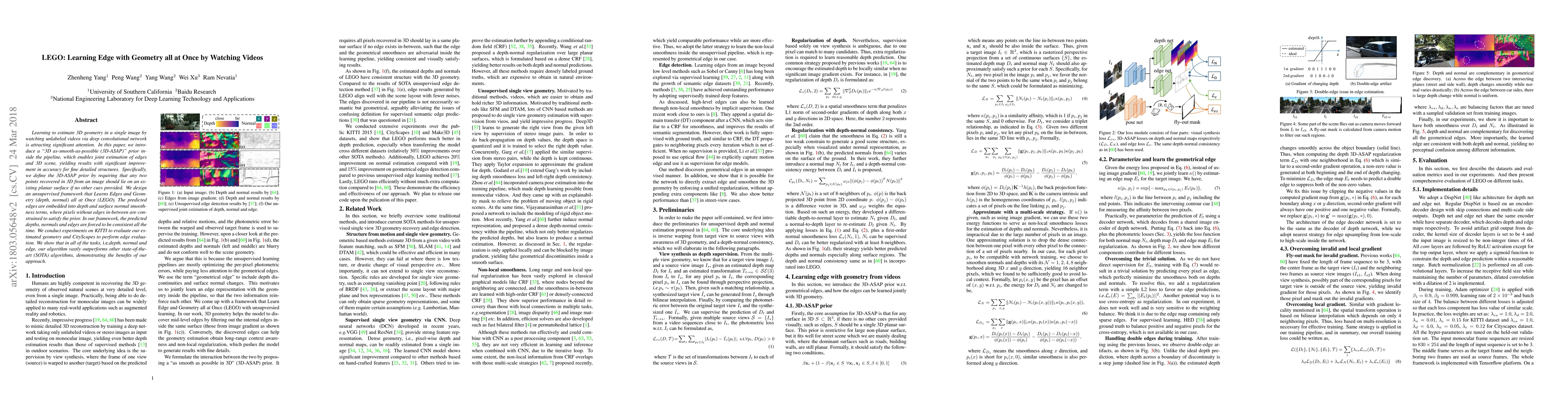 This paper introduces an unsupervised deep convolutional network framework called LEGO that estimates 3D geometry and edges from unlabeled videos using a "3D as-smooth-as-possible" prior, significantly improving accuracy over state-of-the-art methods on datasets like KITTI and CityScapes.