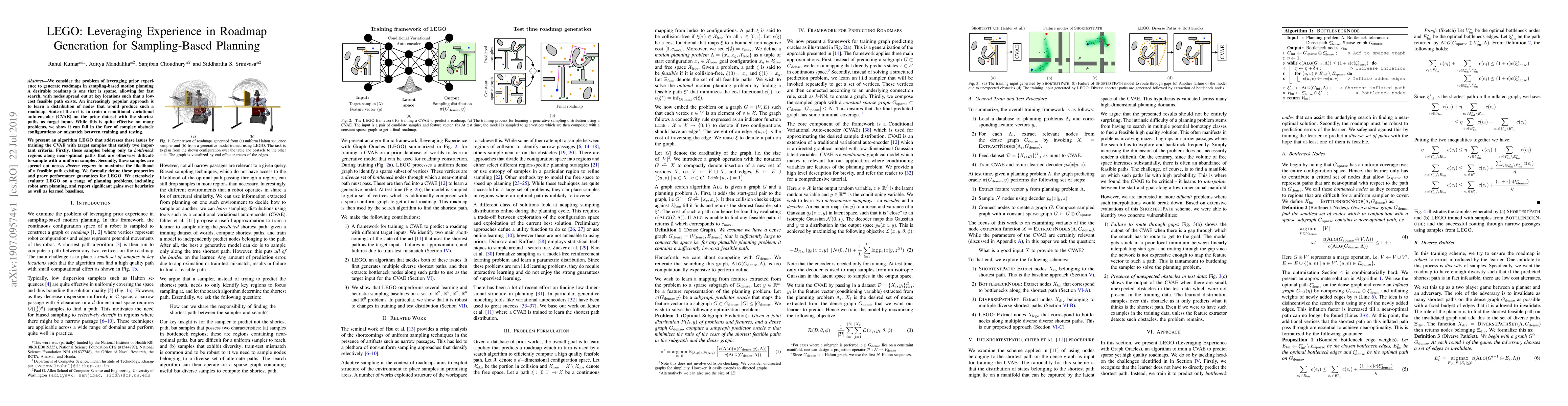LEGO leverages prior experience to improve roadmap generation in sampling-based motion planning by training a conditional variational auto-encoder (CVAE) on samples from bottleneck regions and diverse areas, ensuring feasible paths. The algorithm outperforms heuristics and baselines across various planning problems, demonstrating significant improvements.