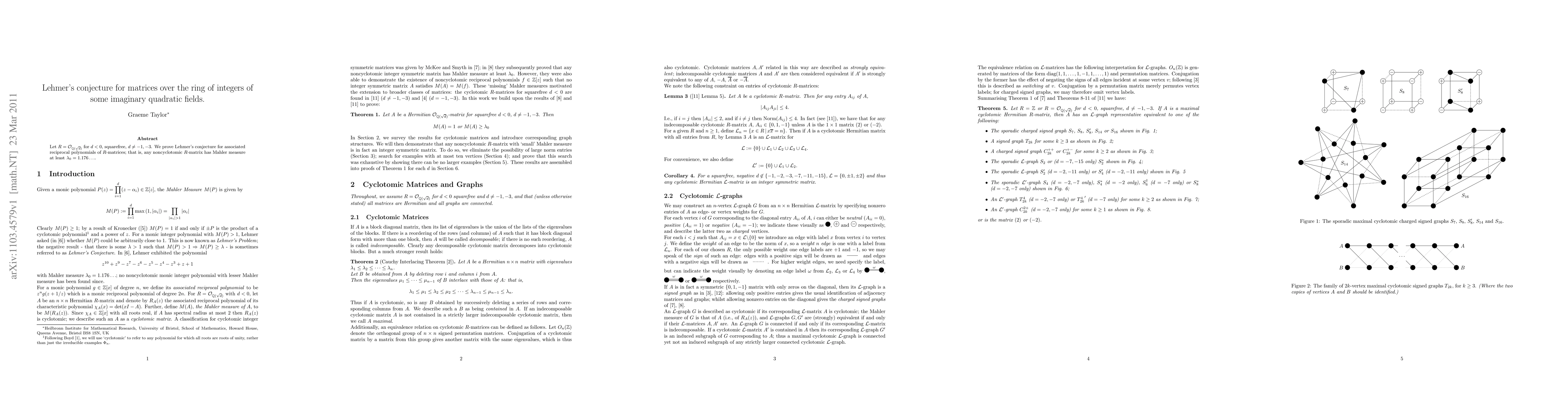 Lehmer's conjecture for matrices over the ring of integers of imaginary quadratic fields is proven for associated reciprocal polynomials, showing that any noncyclotomic matrix has a Mahler measure of at least $\lambda_0=1.176...$.
