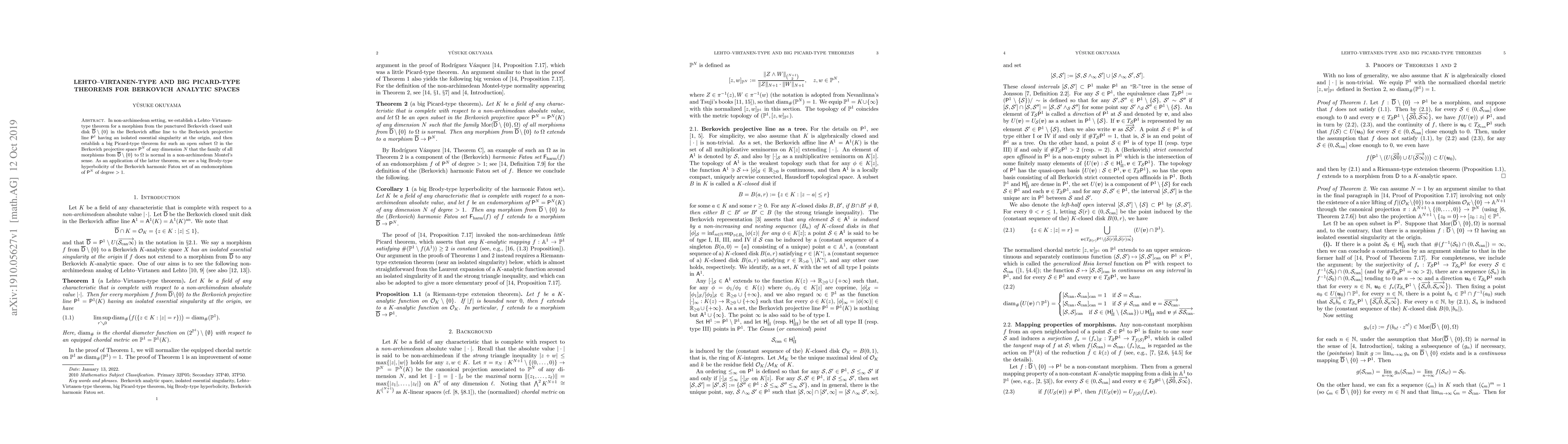 In non-archimedean setting, we establish a Lehto--Virtanen-type theorem for a morphism from the punctured Berkovich closed unit disk $\overline{\mathsf{D}}\setminus\{0\}$ in the Berkovich affine line to the Berkovich projective line $\mathsf{P}^1$ having an isolated essential singularity at the origin, and then establish a big Picard-type theorem for such an open subset $\Omega$ in the Berkovich projective space $\mathsf{P}^N$ of any dimension $N$ that the family of all morphisms from $\overline{\mathsf{D}}\setminus\{0\}$ to $\Omega$ is normal in a non-archimedean Montel's sense. As an application of the latter theorem, we see a big Brody-type hyperbolicity of the Berkovich harmonic Fatou set of an endomorphism of $\mathsf{P}^N$ of degree $>1$.