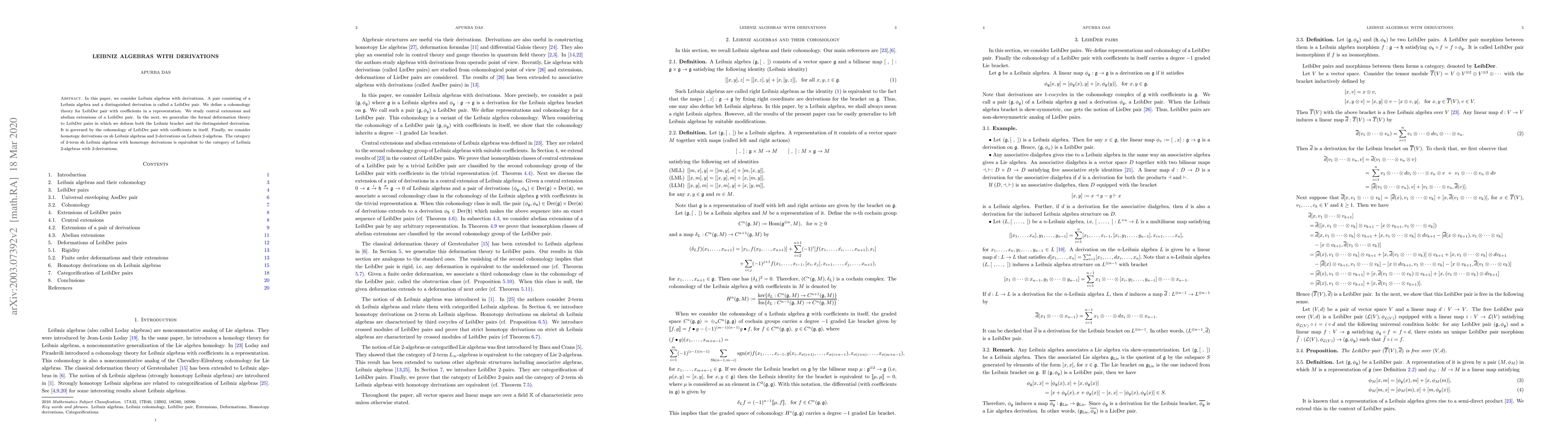 This paper explores Leibniz algebras with derivations, defining a cohomology theory for LeibDer pairs and studying their central and abelian extensions. It extends formal deformation theory to these pairs, governed by their self-cohomology, and relates homotopy derivations on sh Leibniz algebras to $2$-derivations on Leibniz $2$-algebras.
