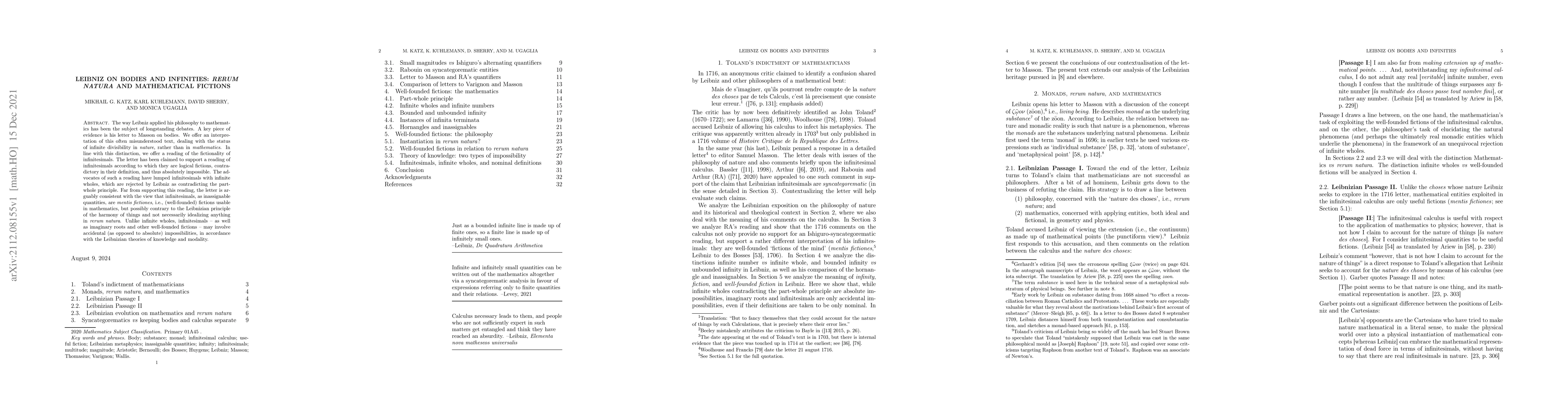 Leibniz's letter to Masson clarifies his stance on the fictionality of infinitesimals, distinguishing them from contradictory infinite wholes, and supports their use as well-founded fictions in mathematics, despite their potential conflict with the harmony of nature. This interpretation aligns infinitesimals with other fictional constructs that may represent accidental impossibilities.