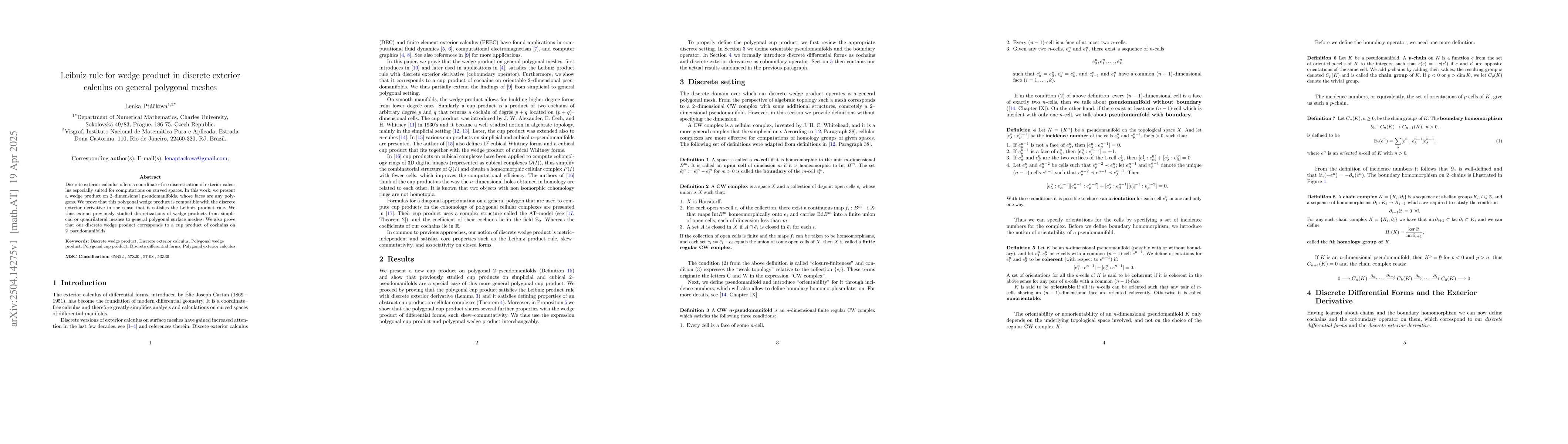 The research presents a new definition of discrete wedge product on polygonal 2-pseudomanifolds and proves its compatibility with the discrete exterior derivative, showing it satisfies the Leibniz product rule (Lemma 3). It also establishes that this polygonal wedge product is a cup product (Theorem 4).