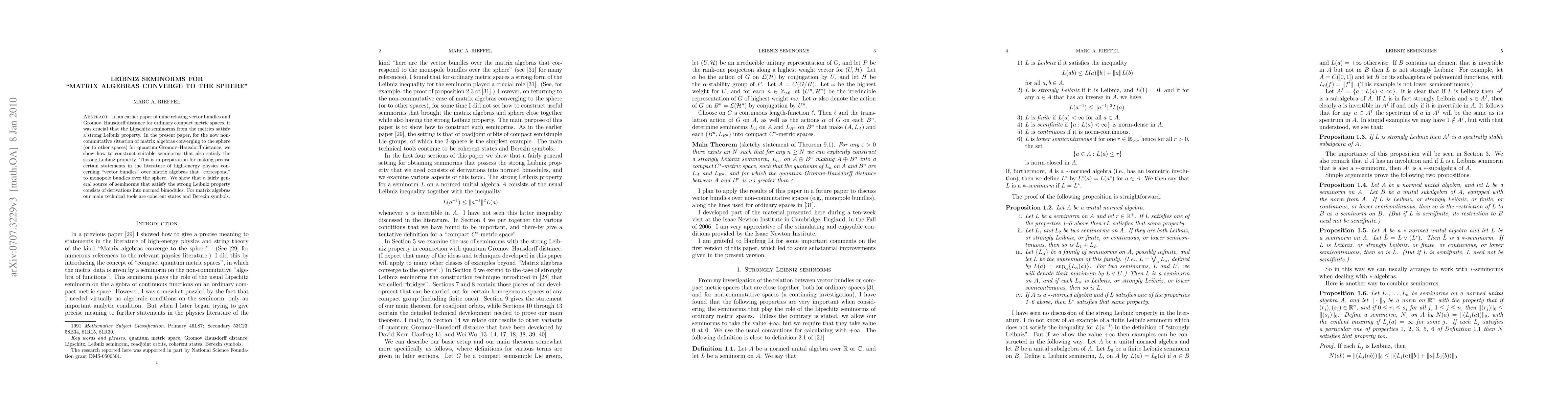 This paper introduces Leibniz seminorms for matrix algebras, which satisfy a strong property allowing them to be used in quantum Gromov-Hausdorff distance calculations. These seminorms have implications for high-energy physics, particularly in the study of vector bundles over matrix algebras.