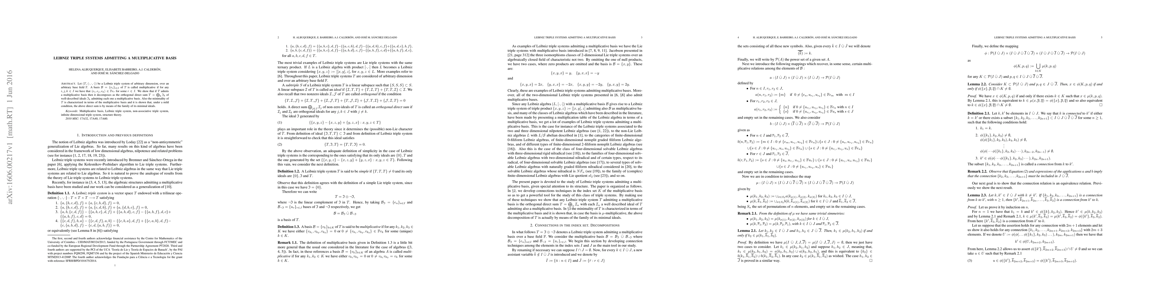 Let $(T,\langle \cdot, \cdot, \cdot \rangle)$ be a Leibniz triple system of arbitrary dimension, over an arbitrary base field ${\mathbb F}$. A basis ${\mathcal B} = \{e_{i}\}_{i \in I}$ of $T$ is called multiplicative if for any $i,j,k \in I$ we have that $\langle e_i,e_j,e_k\rangle\in {\mathbb F}e_r$ for some $r \in I$. We show that if $T$ admits a multiplicative basis then it decomposes as the orthogonal direct sum $T= \bigoplus_k{\mathfrak I}_k$ of well-described ideals ${\mathfrak I}_k$ admitting each one a multiplicative basis. Also the minimality of $T$ is characterized in terms of the multiplicative basis and it is shown that, under a mild condition, the above direct sum is by means of the family of its minimal ideals.