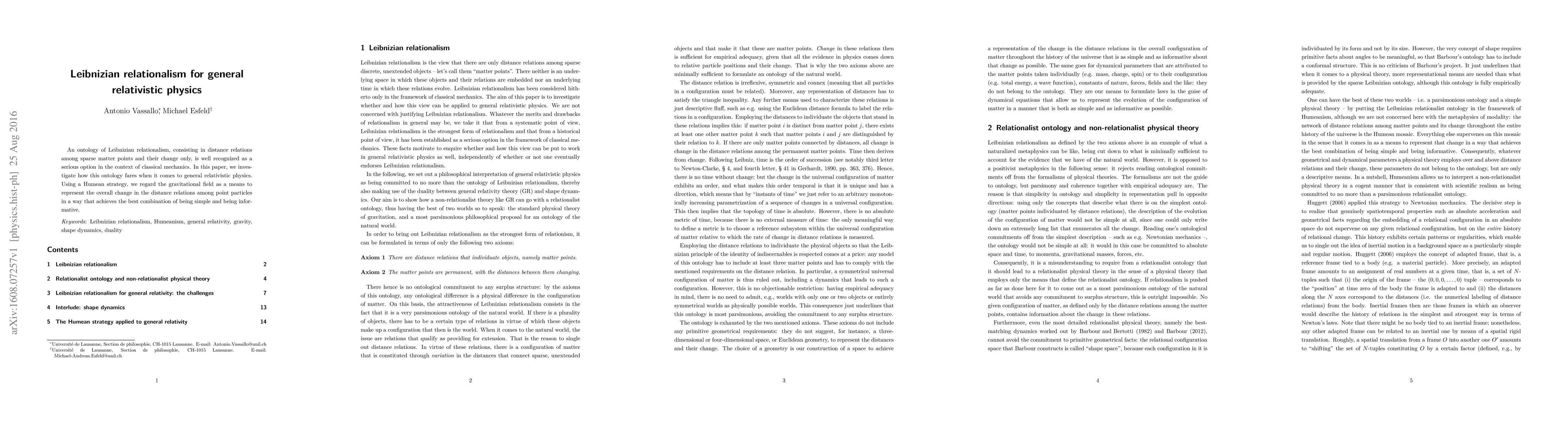 An ontology of Leibnizian relationalism, consisting in distance relations among sparse matter points and their change only, is well recognized as a serious option in the context of classical mechanics. In this paper, we investigate how this ontology fares when it comes to general relativistic physics. Using a Humean strategy, we regard the gravitational field as a means to represent the overall change in the distance relations among point particles in a way that achieves the best combination of being simple and being informative.