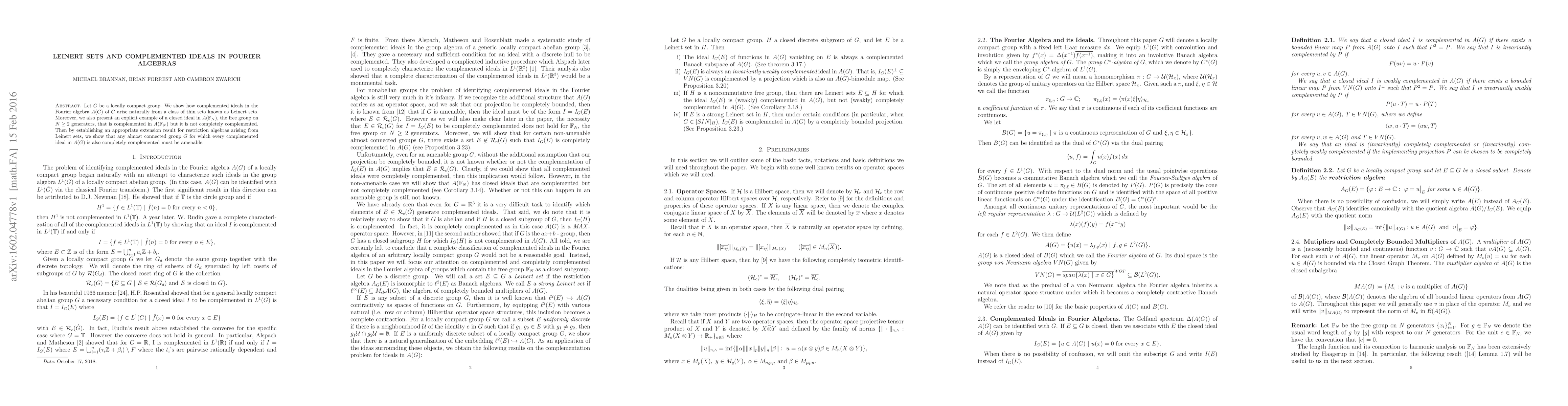 This paper explores the relationship between complemented ideals in the Fourier algebra $A(G)$ of a locally compact group $G$ and Leinert sets, demonstrating that complemented ideals arise from these thin sets. It provides an example of a complemented but not completely complemented ideal in $A(\mathbb{F}_{N})$, and concludes that for almost connected groups where all complemented ideals are completely complemented, amenability must hold.