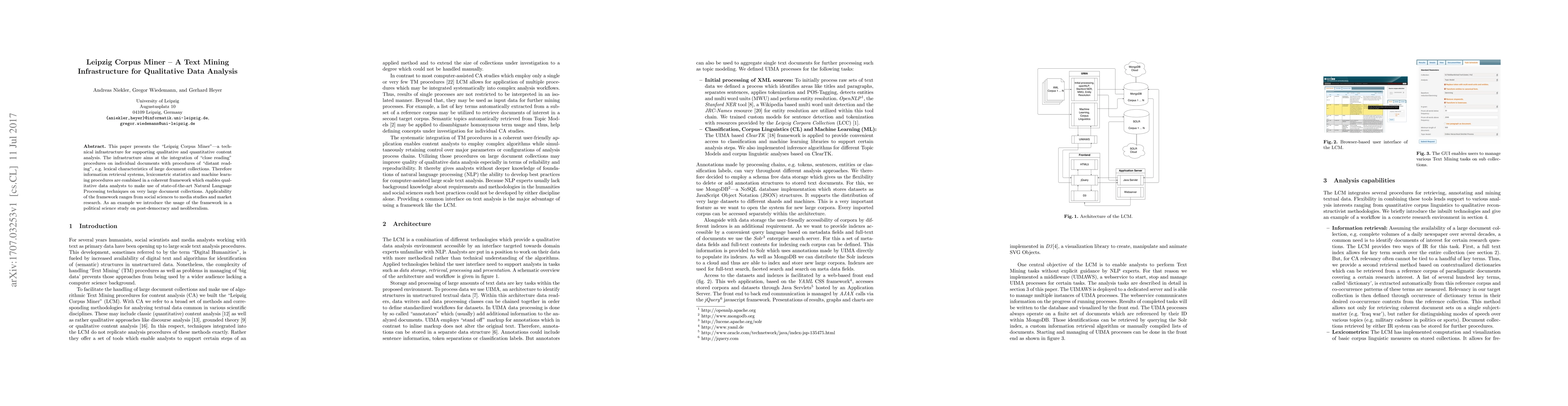 The Leipzig Corpus Miner is a framework that combines natural language processing techniques with qualitative content analysis for large document collections, enabling researchers to analyze social sciences, media studies, and market research topics.