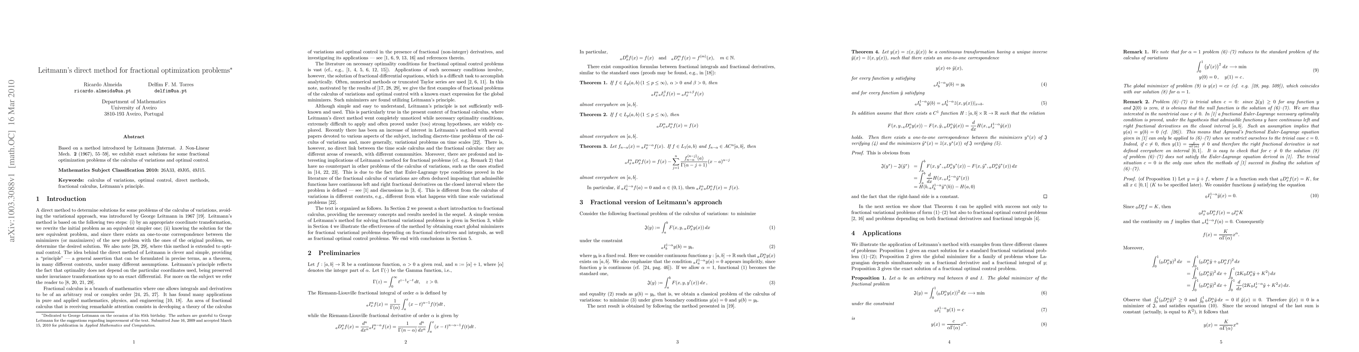 Based on a method introduced by Leitmann [Internat. J. Non-Linear Mech. {\bf 2} (1967), 55--59], we exhibit exact solutions for some fractional optimization problems of the calculus of variations and optimal control.