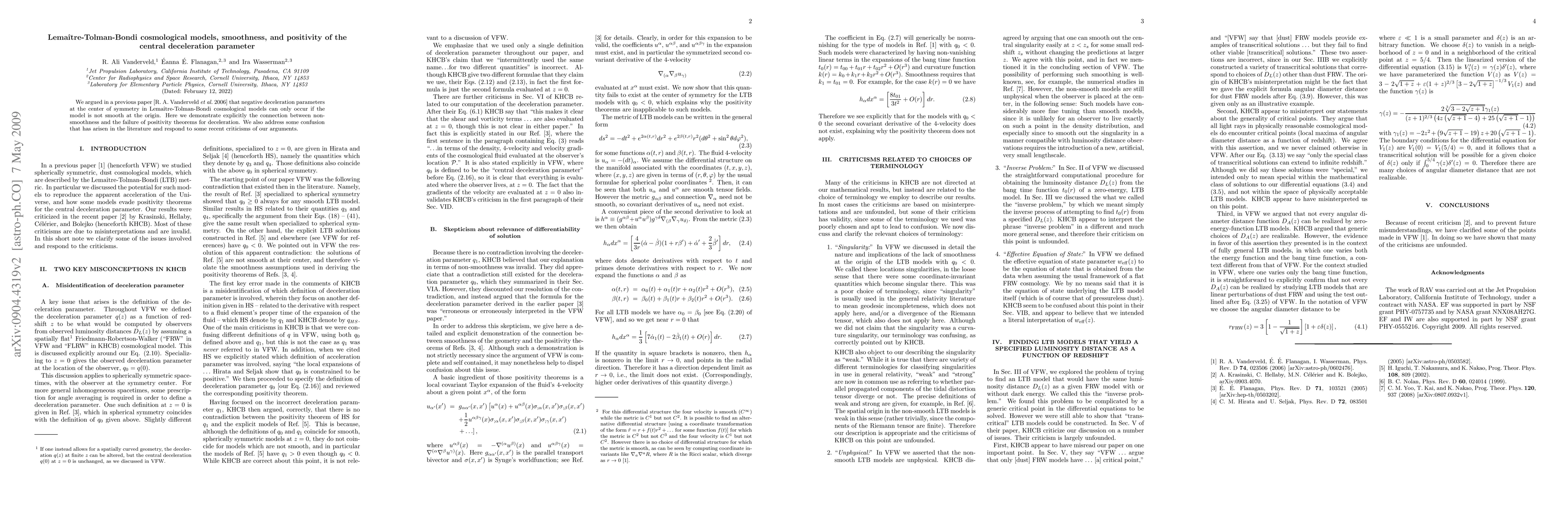 We argued in a previous paper [R. A. Vanderveld et al. 2006, arXiv:astro-ph/0602476] that negative deceleration parameters at the center of symmetry in Lemaitre-Tolman-Bondi cosmological models can only occur if the model is not smooth at the origin. Here we demonstrate explicitly the connection between non-smoothness and the failure of positivity theorems for deceleration. We also address some confusion that has arisen in the literature and respond to some recent criticisms of our arguments.
