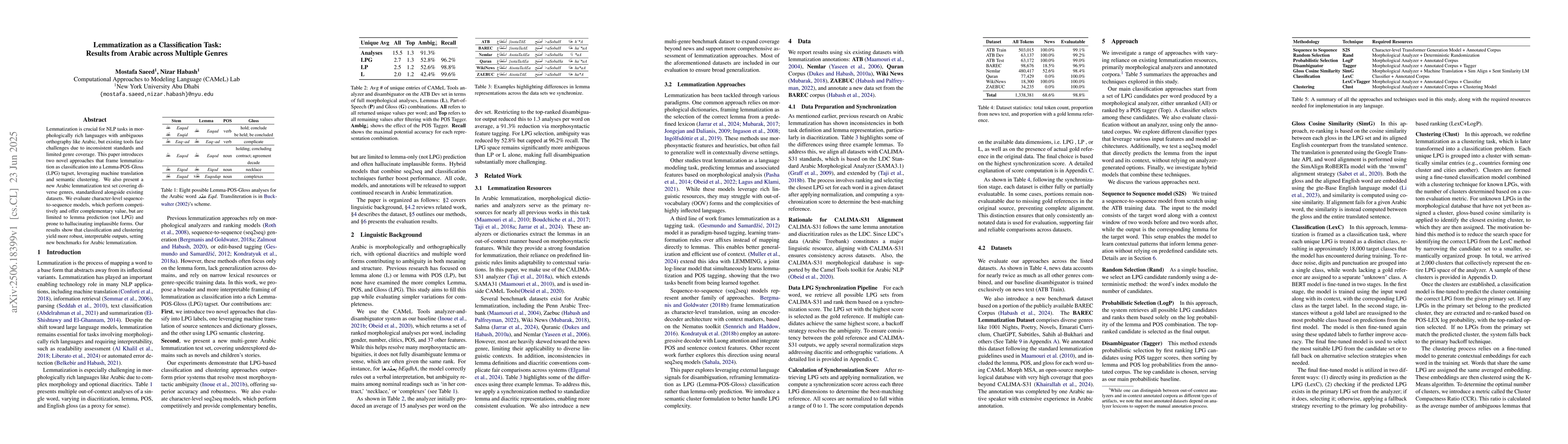 Lemmatization is crucial for NLP tasks in morphologically rich languages with ambiguous orthography like Arabic, but existing tools face challenges due to inconsistent standards and limited genre coverage. This paper introduces two novel approaches that frame lemmatization as classification into a Lemma-POS-Gloss (LPG) tagset, leveraging machine translation and semantic clustering. We also present a new Arabic lemmatization test set covering diverse genres, standardized alongside existing datasets. We evaluate character level sequence-to-sequence models, which perform competitively and offer complementary value, but are limited to lemma prediction (not LPG) and prone to hallucinating implausible forms. Our results show that classification and clustering yield more robust, interpretable outputs, setting new benchmarks for Arabic lemmatization.