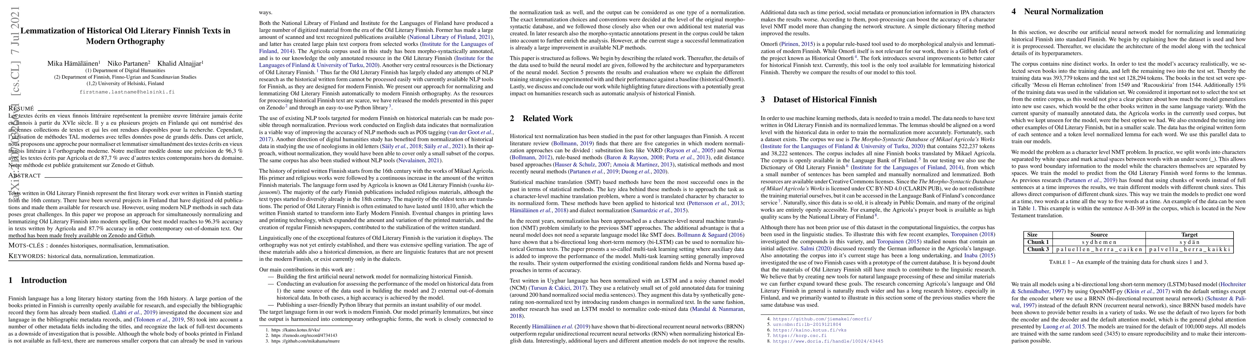 The paper presents an effective artificial neural network model for normalizing and lemmatizing Old Literary Finnish texts into modern orthography, utilizing a bi-directional LSTM-based model with a BRNN encoder.