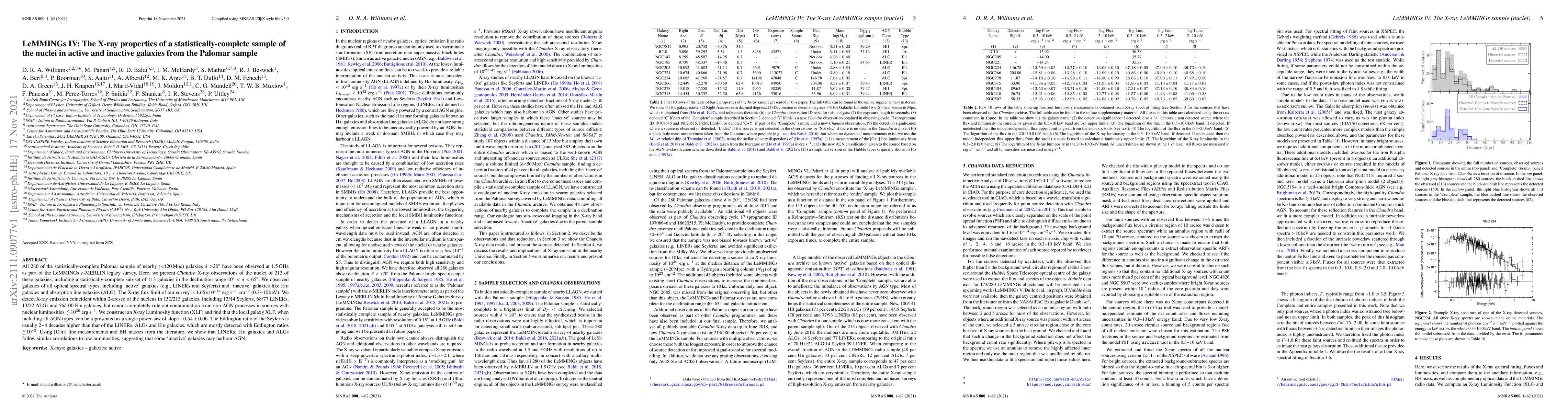 All 280 of the statistically-complete Palomar sample of nearby (<120 Mpc) galaxies dec > 20 degrees have been observed at 1.5 GHz as part of the LeMMINGs e-MERLIN legacy survey. Here, we present Chandra X-ray observations of the nuclei of 213 of these galaxies, including a statistically-complete sub-set of 113 galaxies in the declination range 40 degrees to 65 degrees. We observed galaxies of all optical spectral types, including 'active' galaxies (e.g., LINERs and Seyferts) and 'inactive' galaxies like HII galaxies and absorption line galaxies (ALG). The X-ray flux limit of our survey is 1.65$\times$10$^{-14}$~erg s$^{-1}$ cm$^{-2}$ (0.3$-$10 keV). We detect X-ray emission coincident within 2-arcsec of the nucleus in 150/213 galaxies, including 13/14 Seyferts, 68/77 LINERs, 13/22 ALGs and 56/100 HII galaxies, but cannot completely rule out contamination from non-AGN processes in sources with nuclear luminosities <10$^{39}$ erg s$^{-1}$. We construct an X-ray Luminosity function (XLF) and find that the local galaxy XLF, when including all AGN types, can be represented as a single power-law of slope $-0.54 \pm 0.06$. The Eddington ratio of the Seyferts is usually 2-4 decades higher than that of the LINERs, ALGs and HII galaxies, which are mostly detected with Eddington ratios <10$^{-3}$. Using [O III] line measurements and BH masses from the literature, we show that LINERs, HII galaxies and ALGs follow similar correlations to low luminosities, suggesting that some 'inactive' galaxies may harbour AGN.