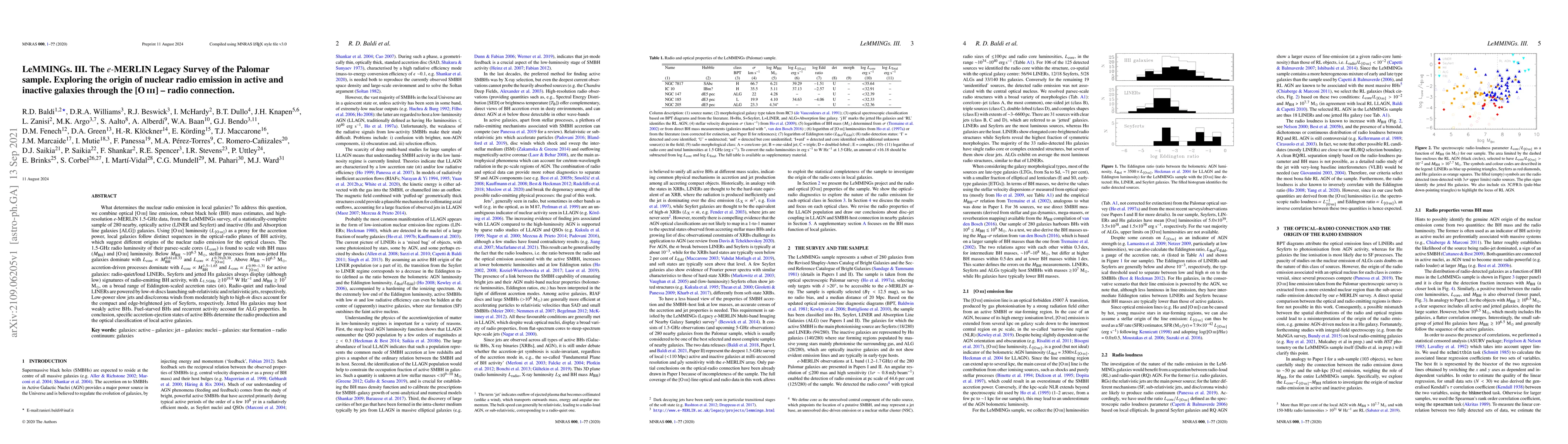 What determines the nuclear radio emission in local galaxies? We combine optical [O III] line emission, robust black hole (BH) mass estimates, and high-resolution e-MERLIN 1.5-GHz data, from the LeMMINGs survey, of a statistically-complete sample of 280 nearby, optically active (LINER and Seyfert) and inactive HII and Absorption line galaxies [ALG]) galaxies. Using [O III] luminosity ($L_{\rm [O~III]}$) as a proxy for the accretion power, local galaxies follow distinct sequences in the optical-radio planes of BH activity, which suggest different origins of the nuclear radio emission for the optical classes. The 1.5-GHz radio luminosity of their parsec-scale cores ($L_{\rm core}$) is found to scale with BH mass ($M_{\rm BH}$) and [O~III] luminosity. Below $M_{\rm BH} \sim$10$^{6.5}$ M$_{\odot}$, stellar processes from non-jetted HII galaxies dominate with $L_{\rm core} \propto M_{\rm BH}^{0.61\pm0.33}$ and $L_{\rm core} \propto L_{\rm [O~III]}^{0.79\pm0.30}$. Above $M_{\rm BH} \sim$10$^{6.5}$ M$_{\odot}$, accretion-driven processes dominate with $L_{\rm core} \propto M_{\rm BH}^{1.5-1.65}$ and $L_{\rm core} \propto L_{\rm [O~III]}^{0.99-1.31}$ for active galaxies: radio-quiet/loud LINERs, Seyferts and jetted HII galaxies always display (although low) signatures of radio-emitting BH activity, with $L_{\rm 1.5\, GHz}\gtrsim$10$^{19.8}$ W Hz$^{-1}$ and $M_{\rm BH}\gtrsim10^{7}$ M$_{\odot}$, on a broad range of Eddington-scaled accretion rates ($\dot{m}$). Radio-quiet and radio-loud LINERs are powered by low-$\dot{m}$ discs launching sub-relativistic and relativistic jets, respectively. Low-power slow jets and disc/corona winds from moderately high to high-$\dot{m}$ discs account for the compact and edge-brightened jets of Seyferts, respectively. Jetted HII galaxies may host weakly active BHs. Fuel-starved BHs and recurrent activity account for ALG properties. [abridged]