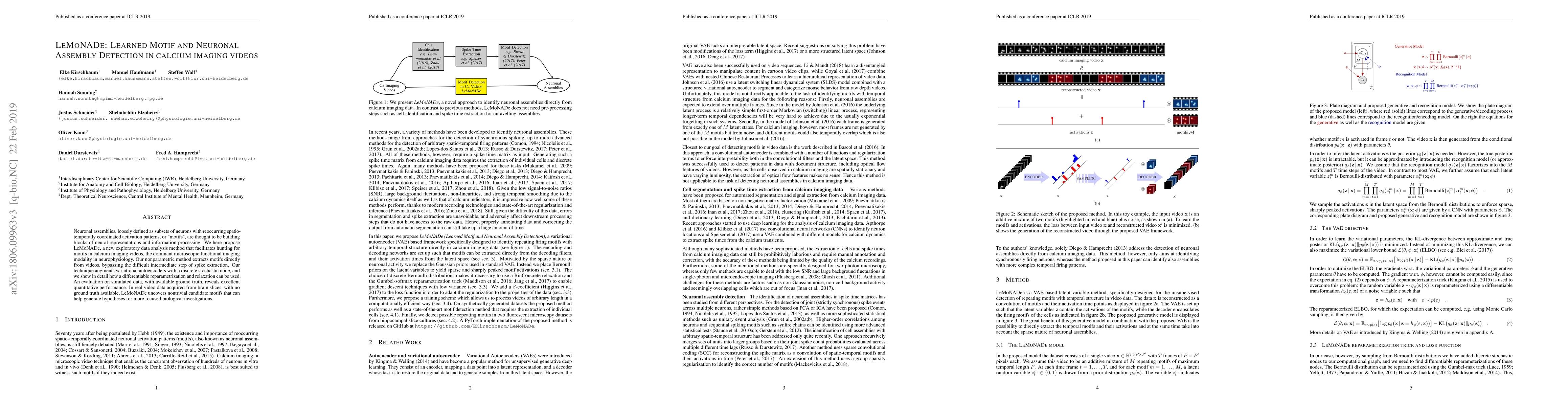 Neuronal assemblies, loosely defined as subsets of neurons with reoccurring spatio-temporally coordinated activation patterns, or "motifs", are thought to be building blocks of neural representations and information processing. We here propose LeMoNADe, a new exploratory data analysis method that facilitates hunting for motifs in calcium imaging videos, the dominant microscopic functional imaging modality in neurophysiology. Our nonparametric method extracts motifs directly from videos, bypassing the difficult intermediate step of spike extraction. Our technique augments variational autoencoders with a discrete stochastic node, and we show in detail how a differentiable reparametrization and relaxation can be used. An evaluation on simulated data, with available ground truth, reveals excellent quantitative performance. In real video data acquired from brain slices, with no ground truth available, LeMoNADe uncovers nontrivial candidate motifs that can help generate hypotheses for more focused biological investigations.