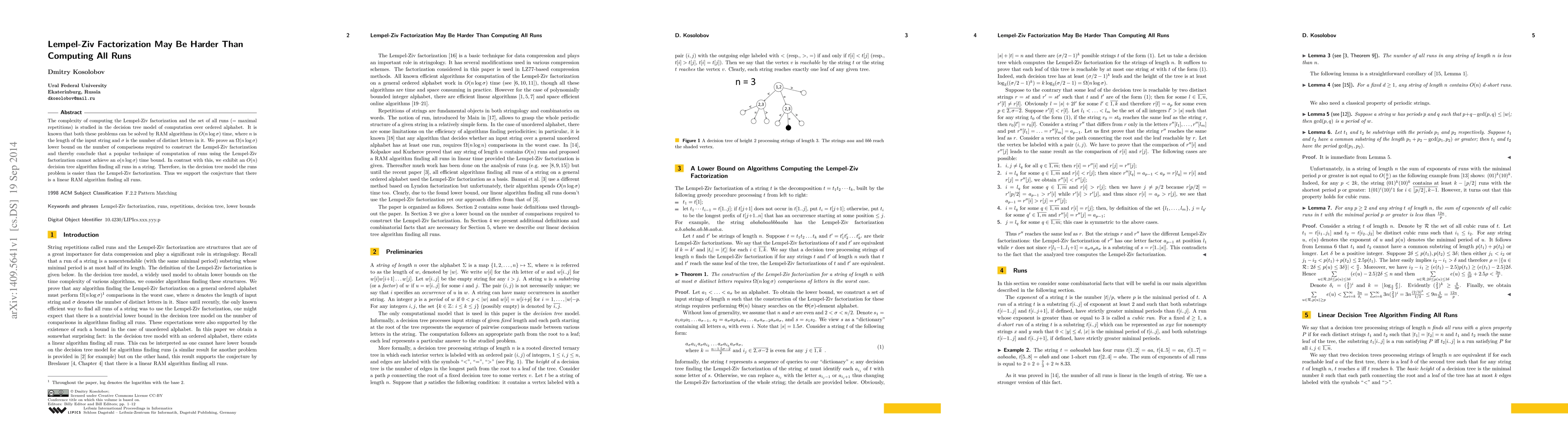 The paper presents a lower bound for Lempel-Ziv factorization and contrasts it with an efficient $O(n)$ algorithm for finding all runs, highlighting discrepancies between the complexity of these two problems in the decision tree model.