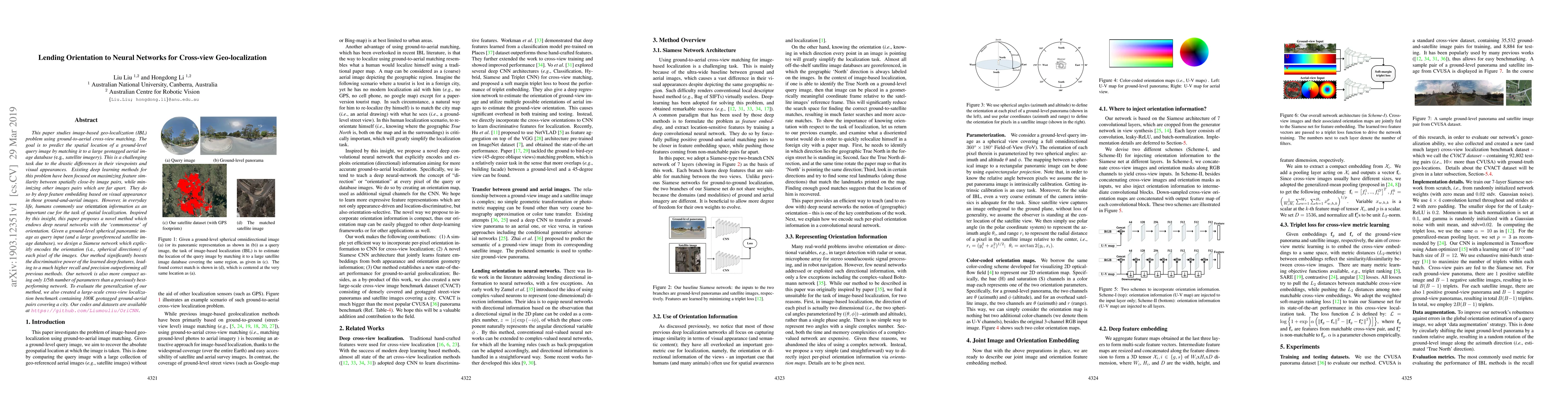 This paper studies image-based geo-localization (IBL) problem using ground-to-aerial cross-view matching. The goal is to predict the spatial location of a ground-level query image by matching it to a large geotagged aerial image database (e.g., satellite imagery). This is a challenging task due to the drastic differences in their viewpoints and visual appearances. Existing deep learning methods for this problem have been focused on maximizing feature similarity between spatially close-by image pairs, while minimizing other images pairs which are far apart. They do so by deep feature embedding based on visual appearance in those ground-and-aerial images. However, in everyday life, humans commonly use {\em orientation} information as an important cue for the task of spatial localization. Inspired by this insight, this paper proposes a novel method which endows deep neural networks with the `commonsense' of orientation. Given a ground-level spherical panoramic image as query input (and a large georeferenced satellite image database), we design a Siamese network which explicitly encodes the orientation (i.e., spherical directions) of each pixel of the images. Our method significantly boosts the discriminative power of the learned deep features, leading to a much higher recall and precision outperforming all previous methods. Our network is also more compact using only 1/5th number of parameters than a previously best-performing network. To evaluate the generalization of our method, we also created a large-scale cross-view localization benchmark containing 100K geotagged ground-aerial pairs covering a city. Our codes and datasets are available at \url{https://github.com/Liumouliu/OriCNN}.