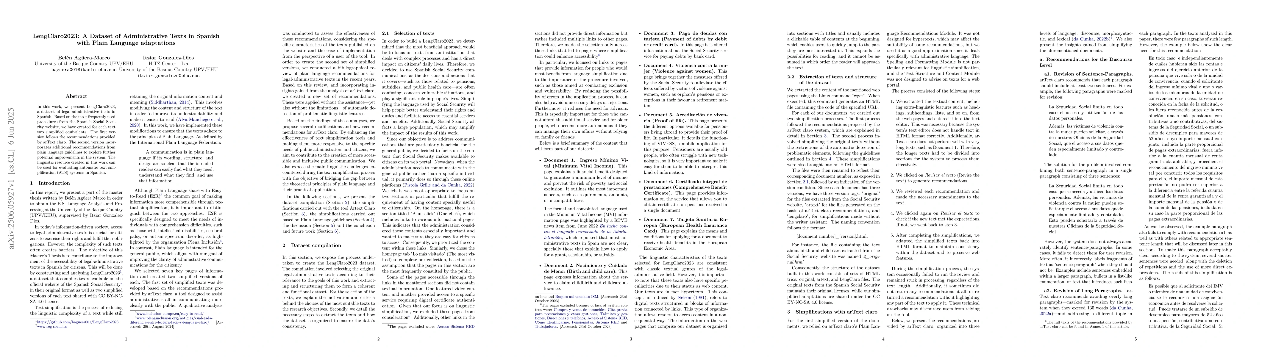 The paper introduces LengClaro2023, a dataset of simplified Spanish legal-administrative texts derived from the Spanish Social Security website. It comprises two versions of each text: one simplified using arText claro guidelines and another with additional plain language recommendations. This resource aims to evaluate automatic text simplification systems in Spanish.