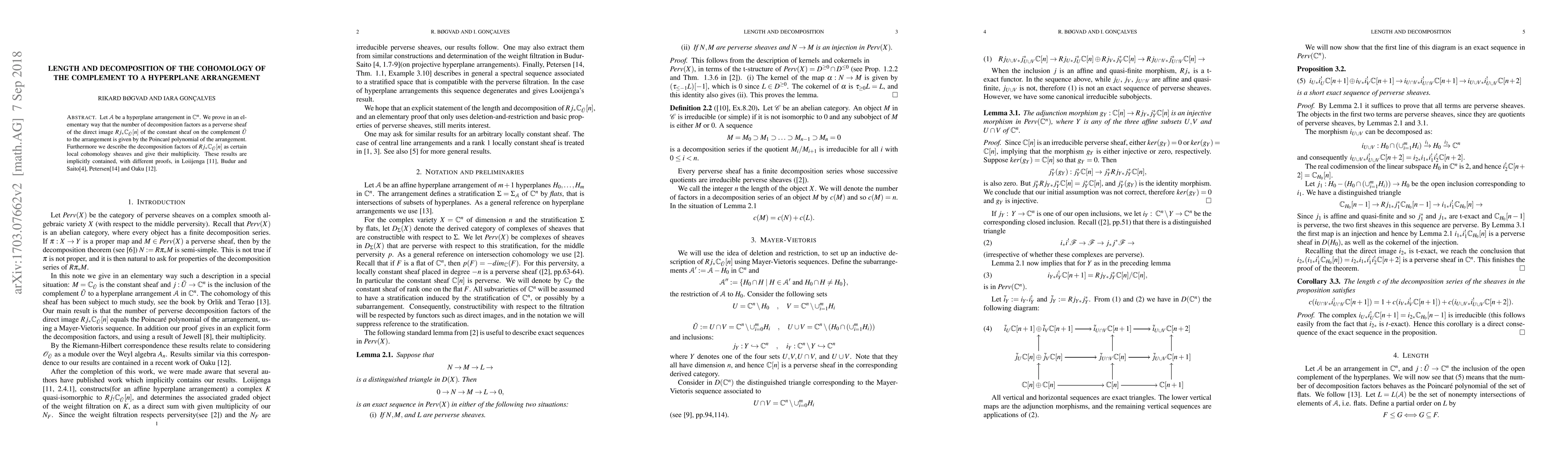 Let $\mathcal A$ be a hyperplane arrangement in $\mathbb C^n$. We show that the number of decomposition factors as a perverse sheaf of the direct image $Rj_*\mathbb C_U $ of the constant sheaf on the complement $U$ to the arrangement is given by the Poincar\'e polynomial of the arrangement. Furthermore we describe the composition factors of $Rj_*\mathbb C_U $ as certain local cohomology sheaves and give their multiplicity.