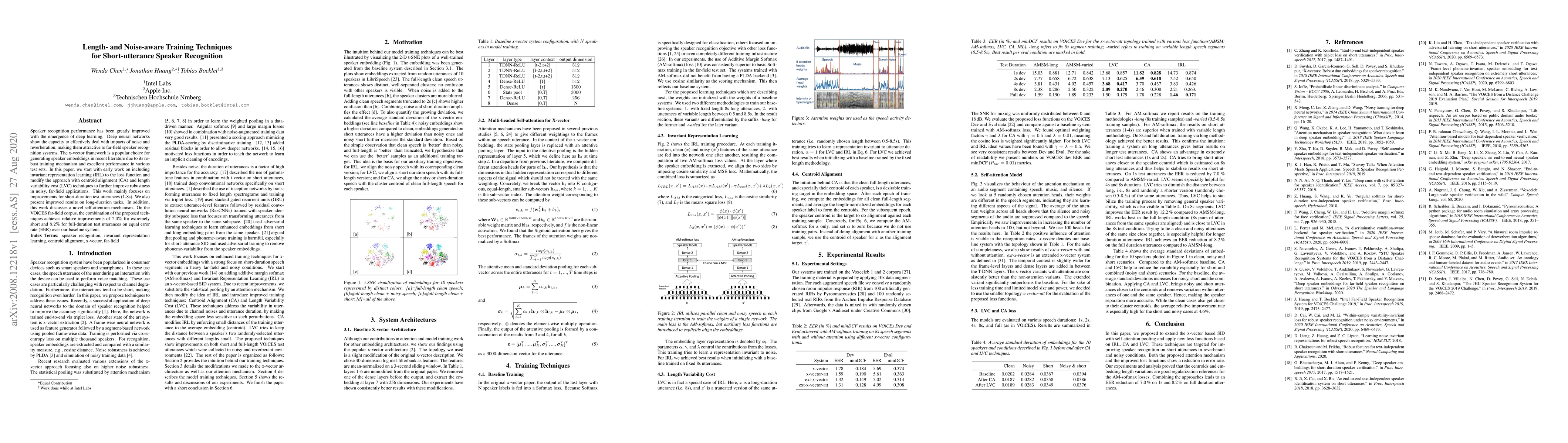 This paper proposes enhanced training techniques for short-utterance speaker recognition using deep neural networks, focusing on noise and length variability. The improvements include centroid alignment and length variability cost, achieving notable reductions in equal error rate on the VOiCES far-field corpus.