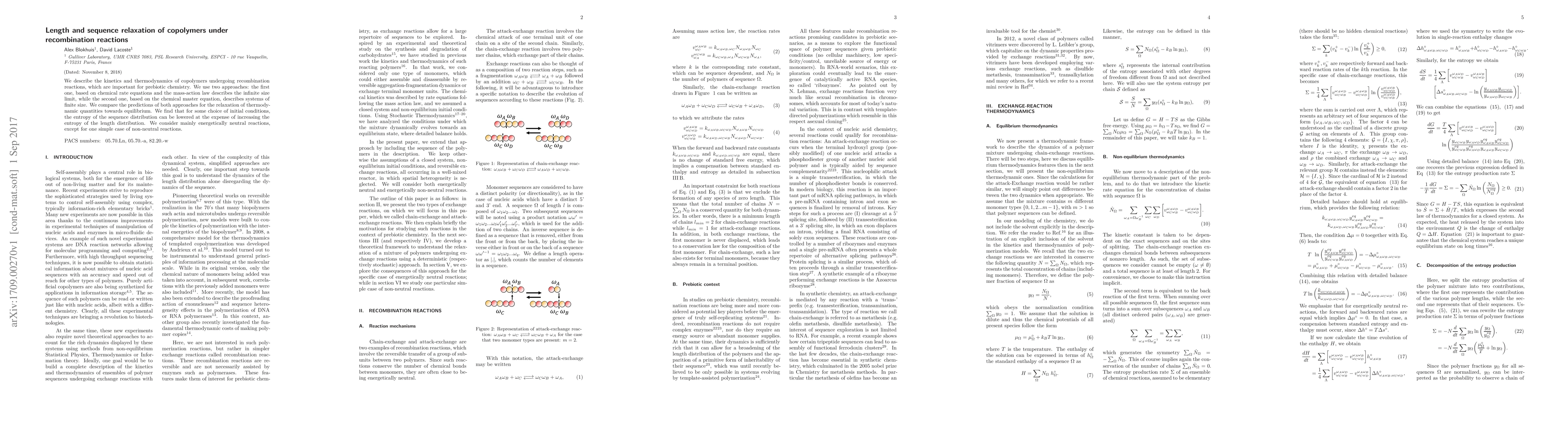 We describe the kinetics and thermodynamics of copolymers undergoing recombination reactions, which are important for prebiotic chemistry. We use two approaches: the first one, based on chemical rate equations and the mass-action law describes the infinite size limit, while the second one, based on the chemical master equation, describes systems of finite size. We compare the predictions of both approaches for the relaxation of thermodynamic quantities towards equilibrium. We find that for some choice of initial conditions, the entropy of the sequence distribution can be lowered at the expense of increasing the entropy of the length distribution. We consider mainly energetically neutral reactions, except for one simple case of non-neutral reactions.